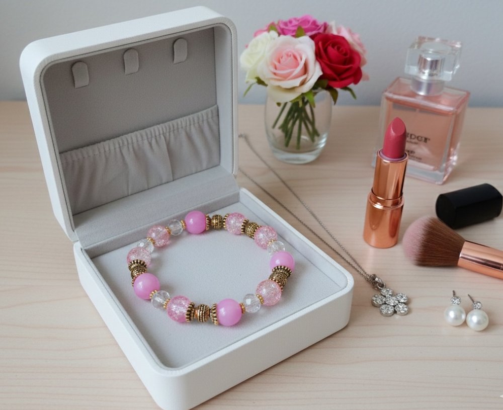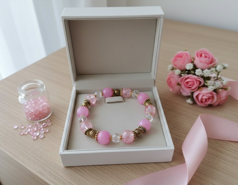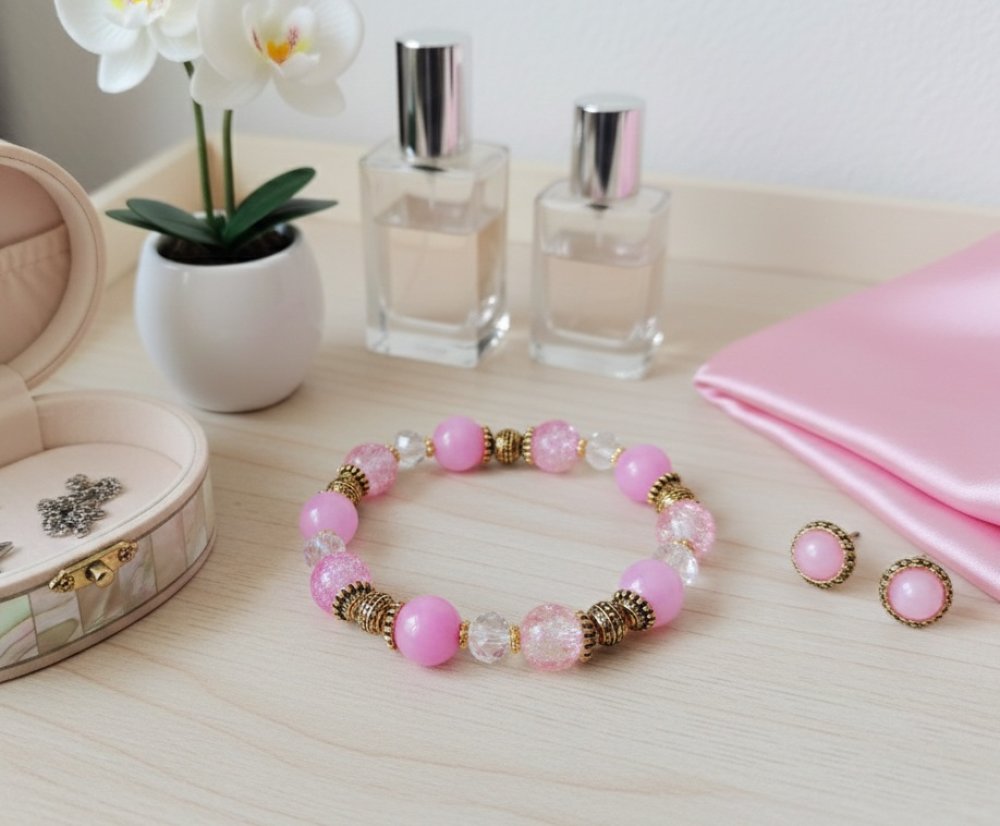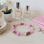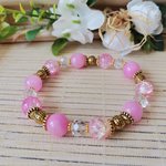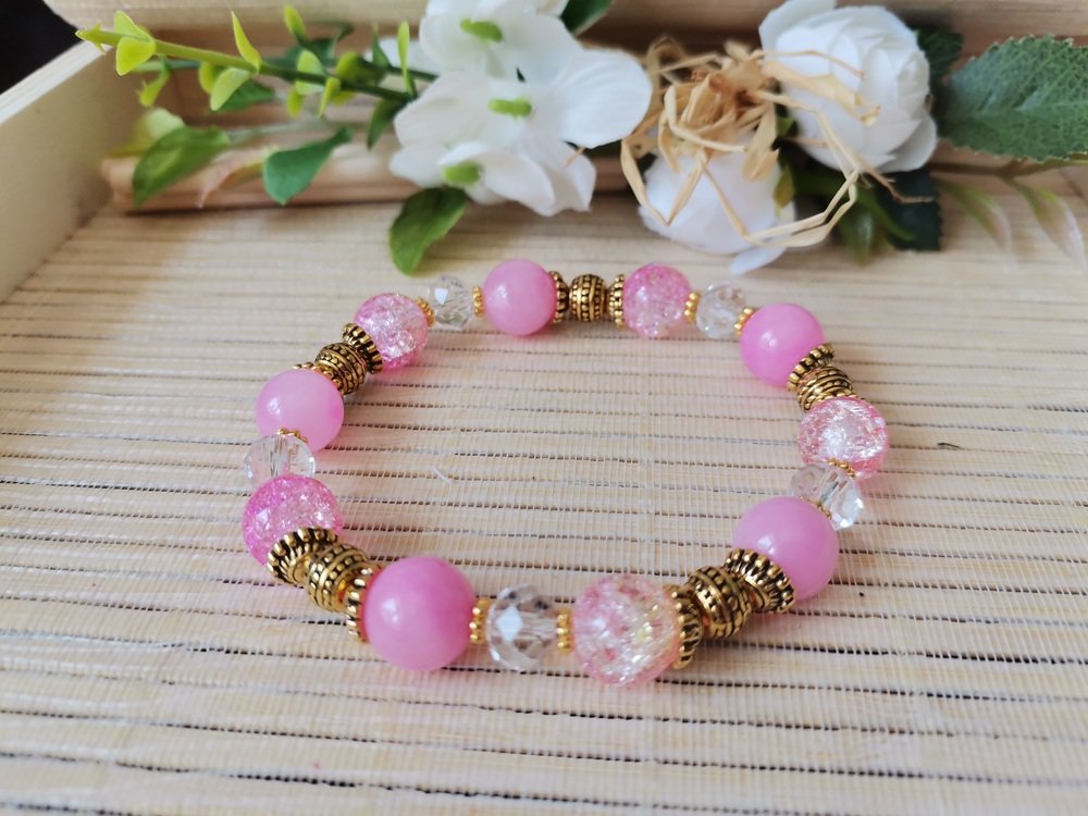 Bracelet sur fil élastique avec perles jade rose et verre craquelé de 10 mm de couleur rose et apprêts de couleur doré