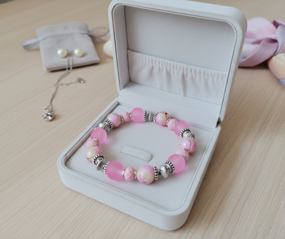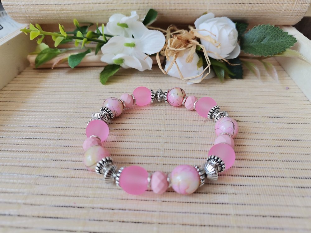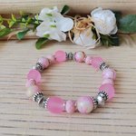 Bracelet sur fil élastique avec perles jade rose de 10 mm, perles en verre givré et apprêts de couleur argent mat