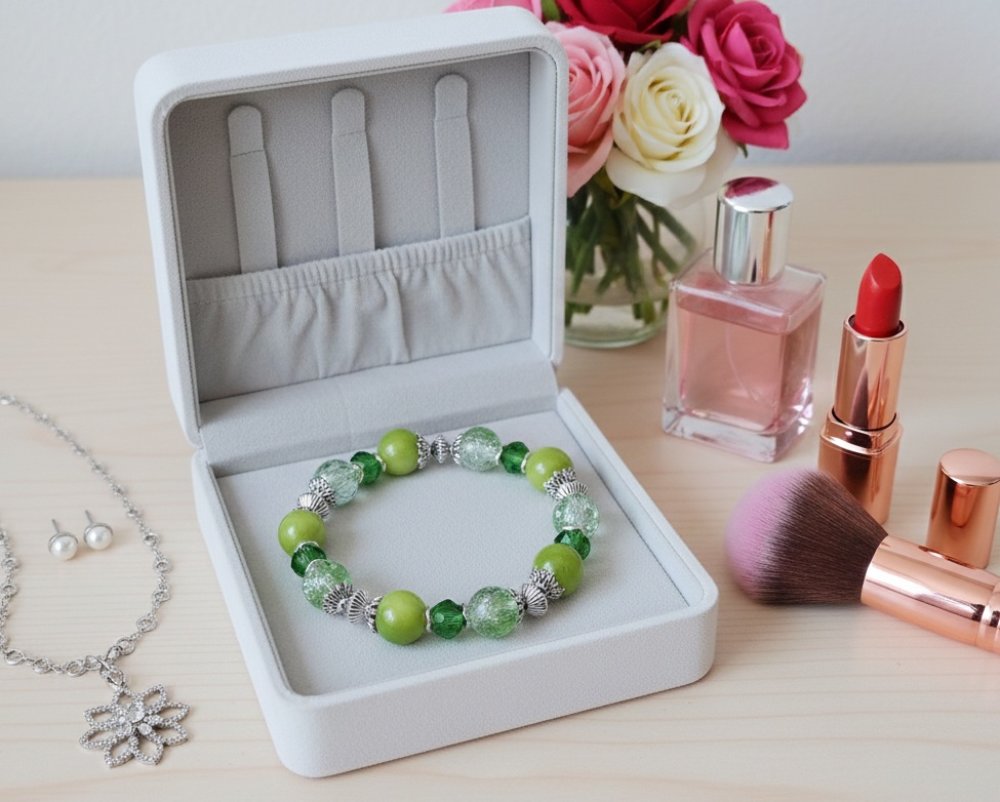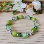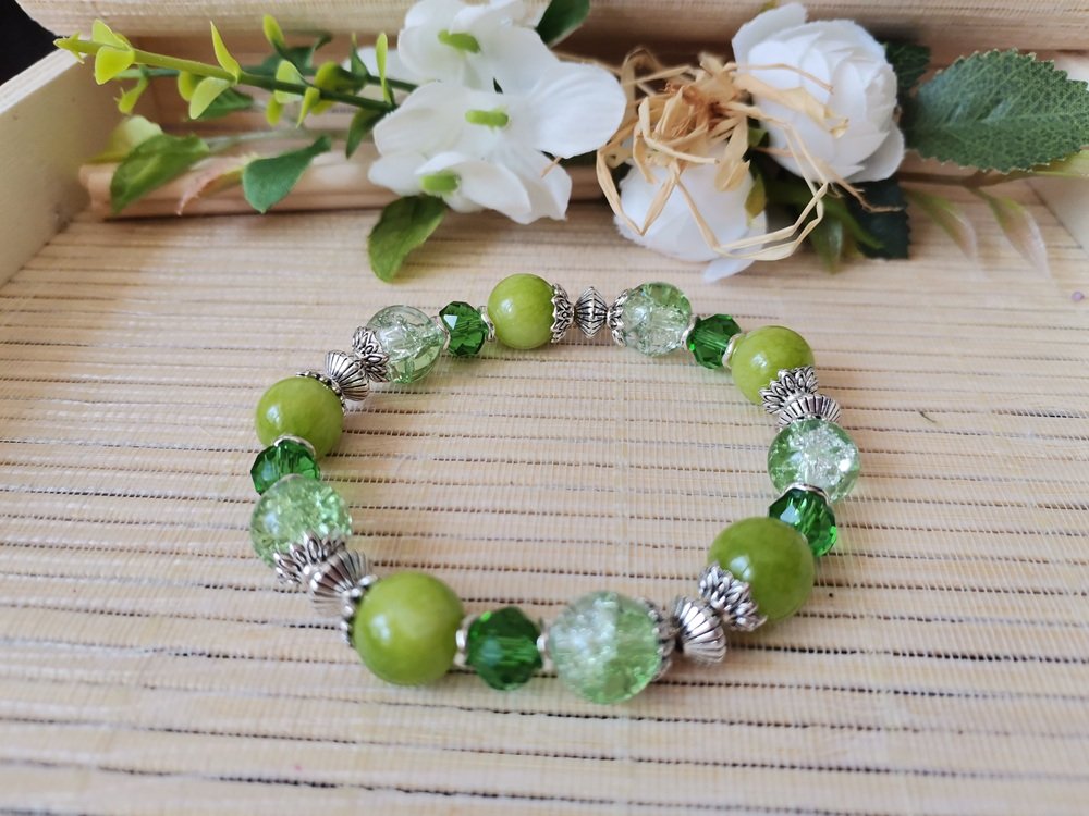 Bracelet sur fil élastique avec perles jade verte et verre craquelé de 10 mm de couleur verte et apprêts de couleur argent mat