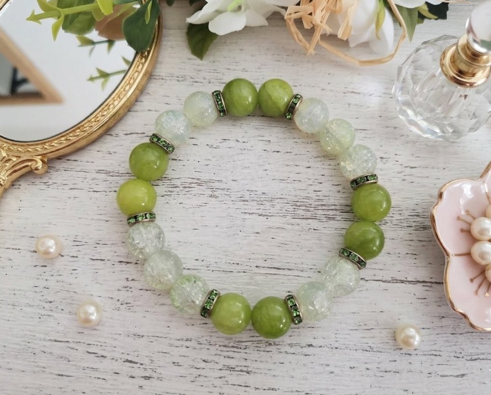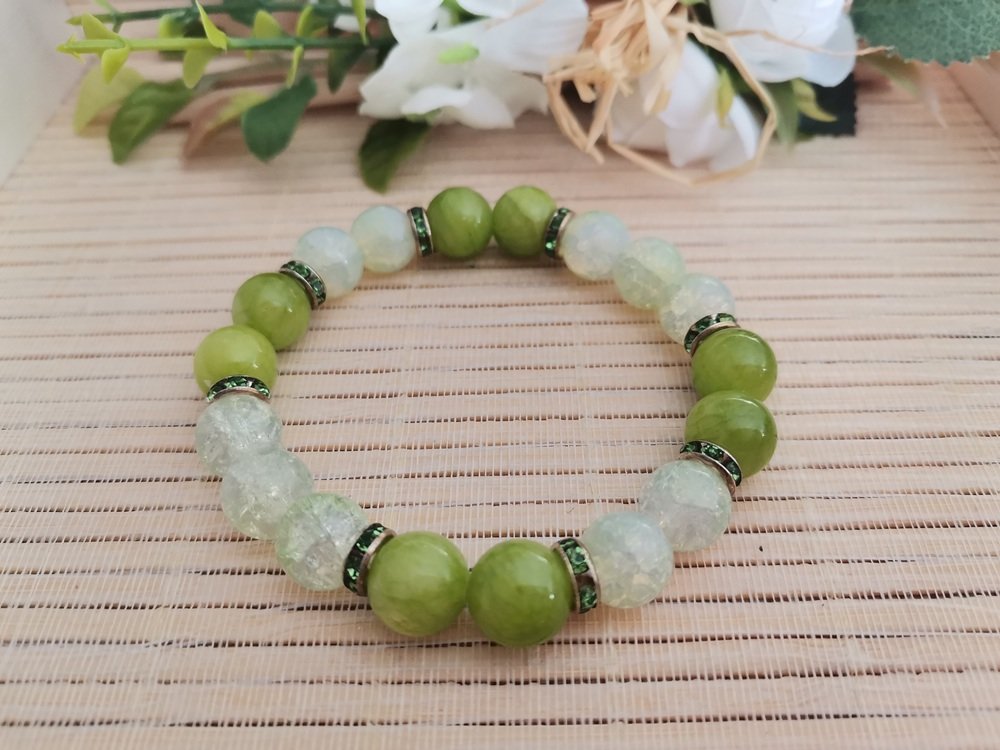 Bracelet sur fil élastique avec perles jade vertes, perles en verre craquelé vert pale de 10 mm et rondelle strass