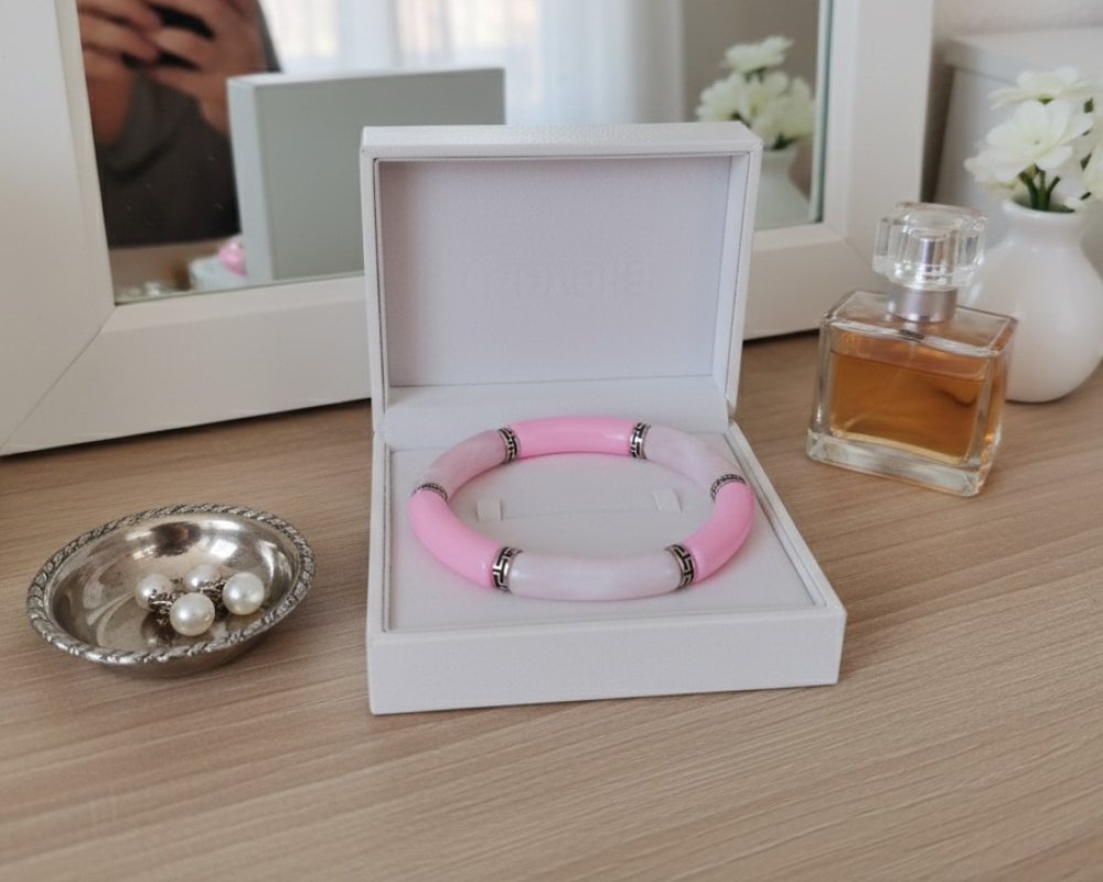 Bracelet sur fil élastique avec perles tubes incurvées et perles métal intercalaires 8 mm de couleur argent mat