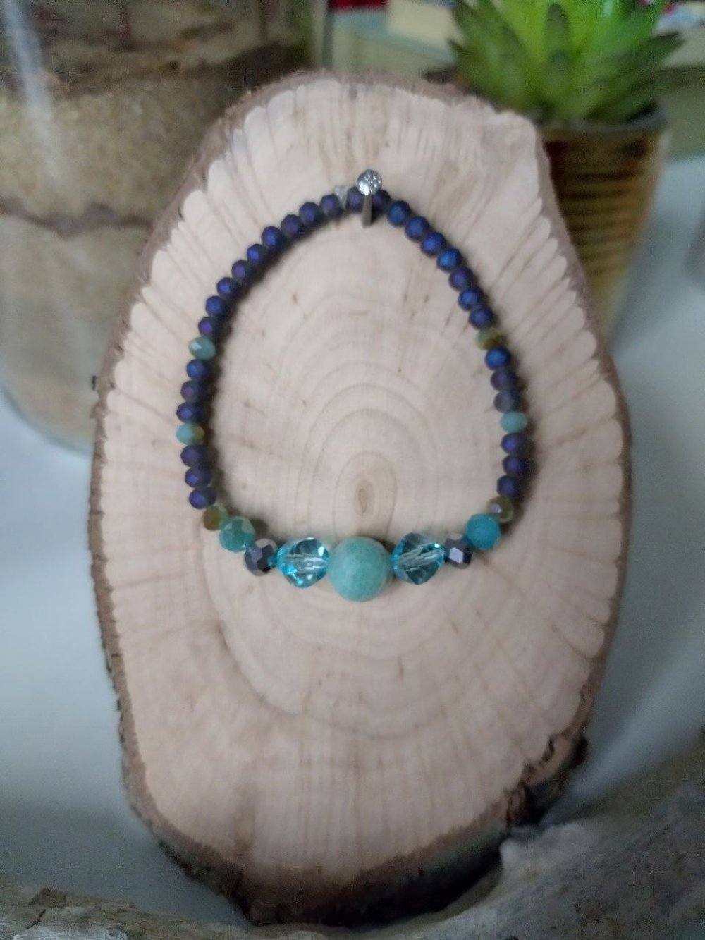Ce bracelet élastique de 16 cm est composé de perles d’amazonite et de perles en verre, pour un bijou élégant et porteur d’énergie douce.