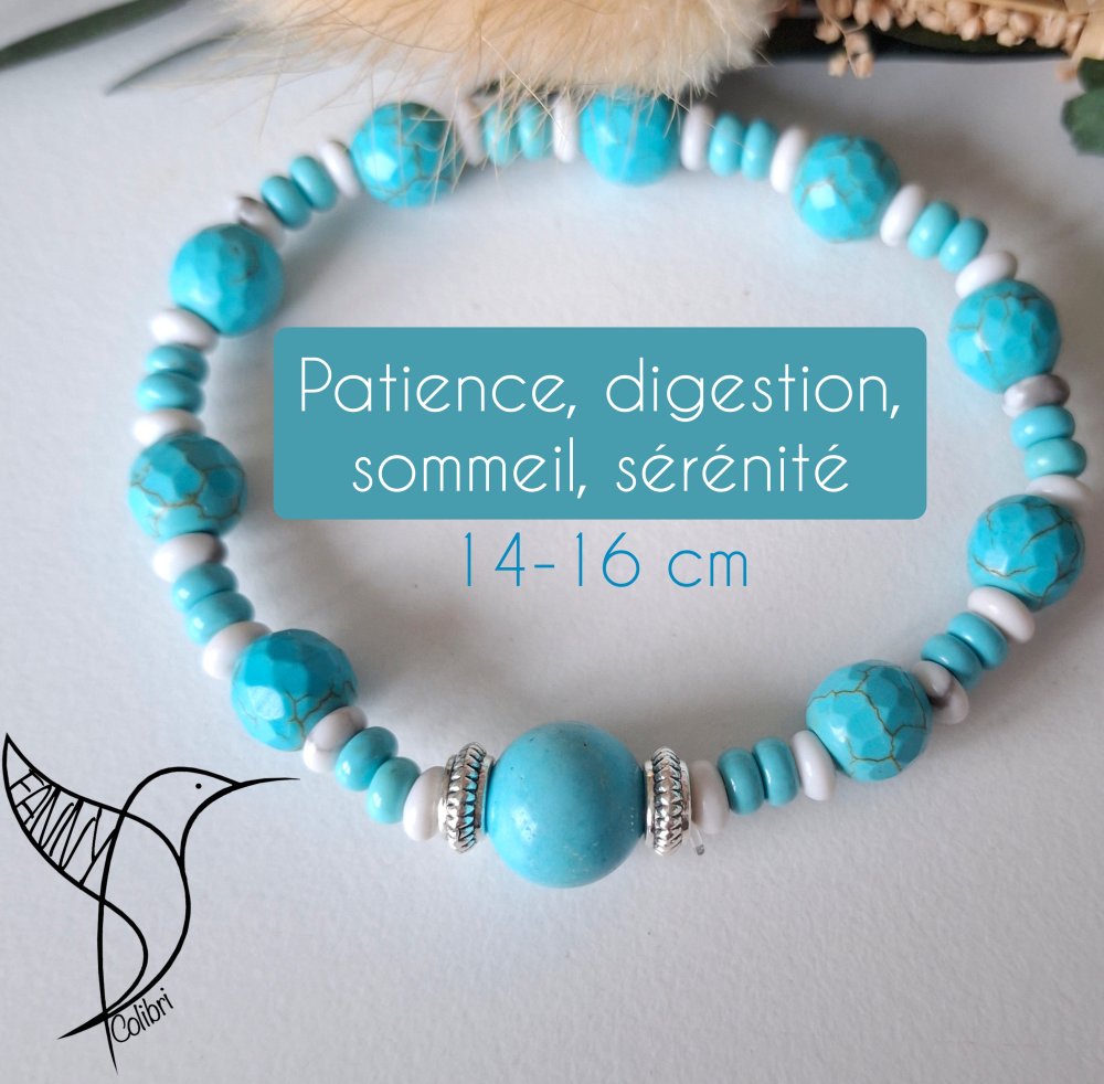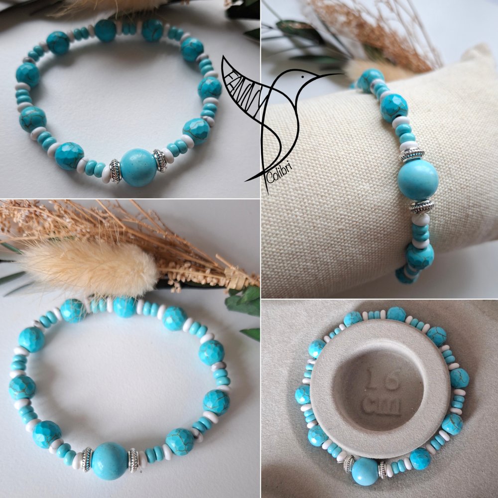 Voici un bracelet élastiqué monté sur un fil stretch de 0,8mm, il est composé de perles howlite blanches et turquoise. Il est parfait pour un poignet de 14 et 16 cm.