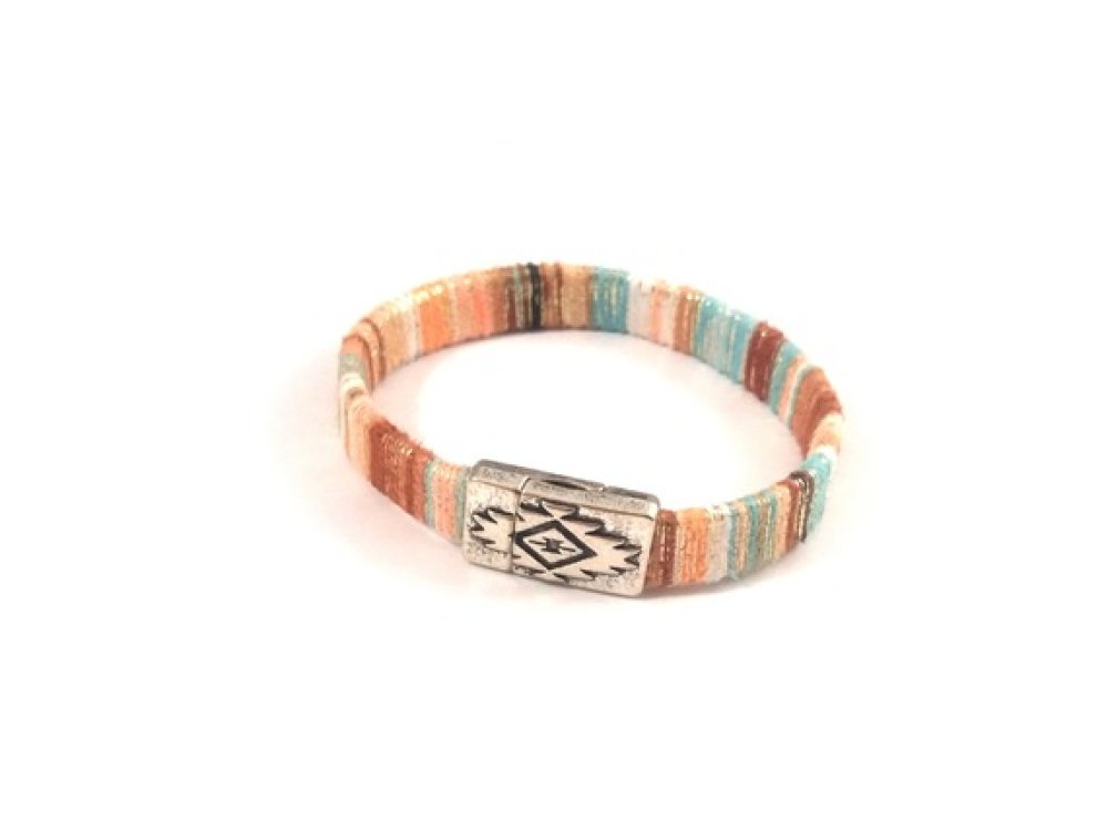 Bracelet cordon plat en velours multicolore. Le fermoir magnétique ethnique est en métal couleur argenté.