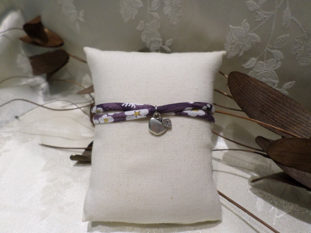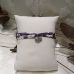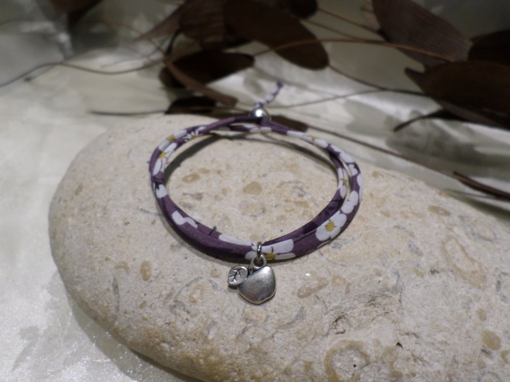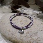 Bracelet adolescente femme en cordon Liberty fleuri violet, agrémenté d'un pendentif pomme argenté. Un bijou fait main, original et plein de fantaisie, parfait pour un cadeau de Noël, anniversaire, ou Fête des mères