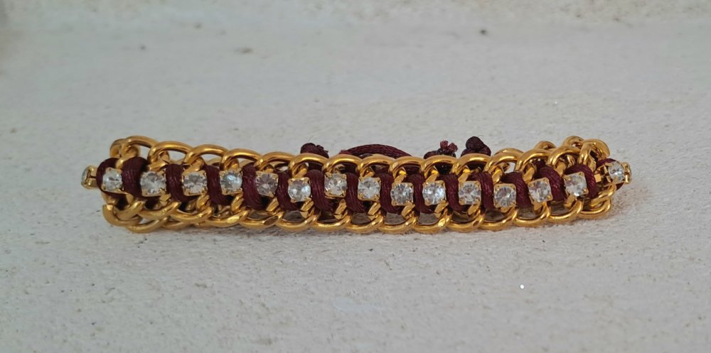 Dans une chaîne dorée j'ai entrelacé un fin ruban de strass blanc et un cordon rouge/bordeaux.