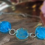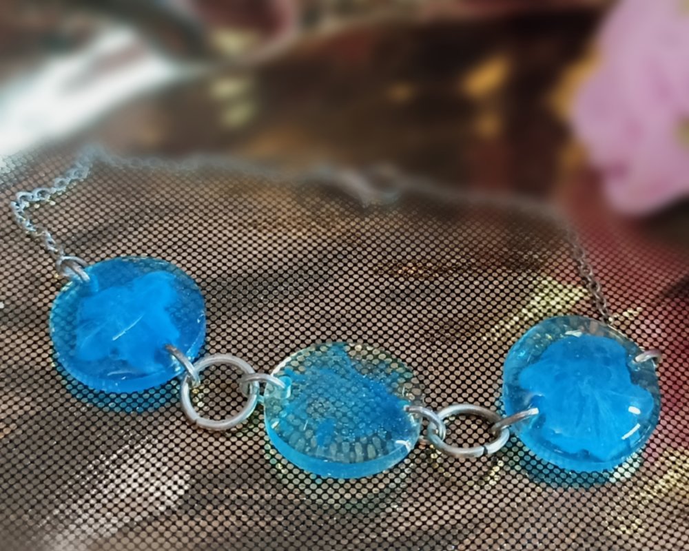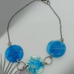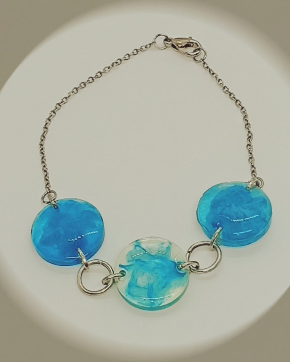 Bracelet en résine époxy teinté à l'encre bleu et monté sur une chaîne en acier inoxydable