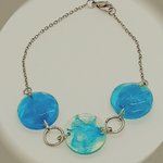 Le bracelet est structuré autour de trois disques de résine époxy translucides teintée à l'encre bleu, reliés par des anneaux et une chaînette en acier inoxydable.