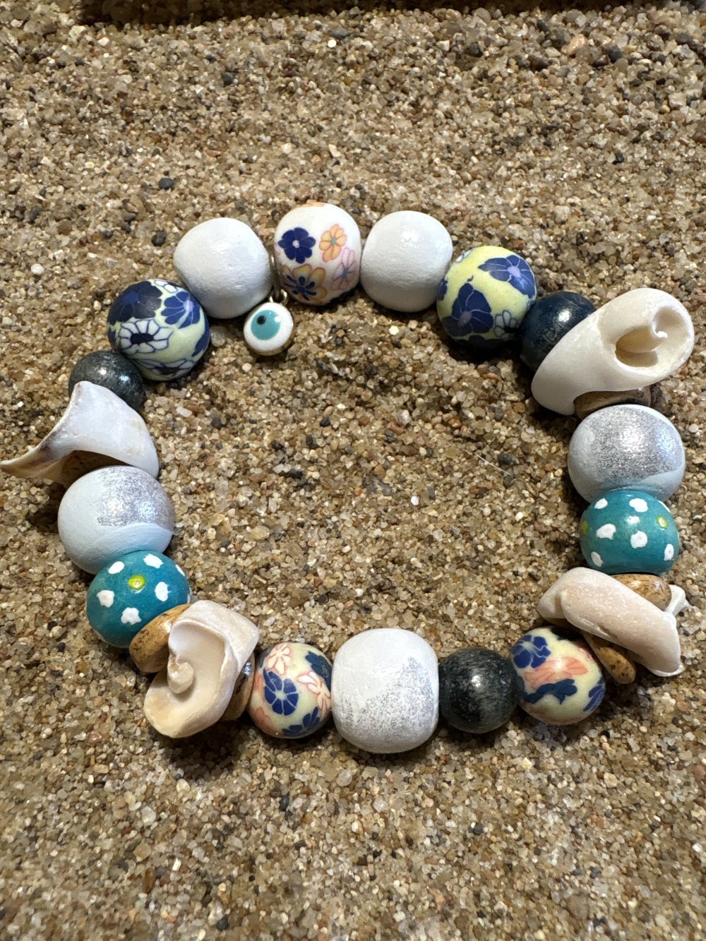 Ce bracelet est réalisé avec des perles de bois des coquillages et des rondelles coco