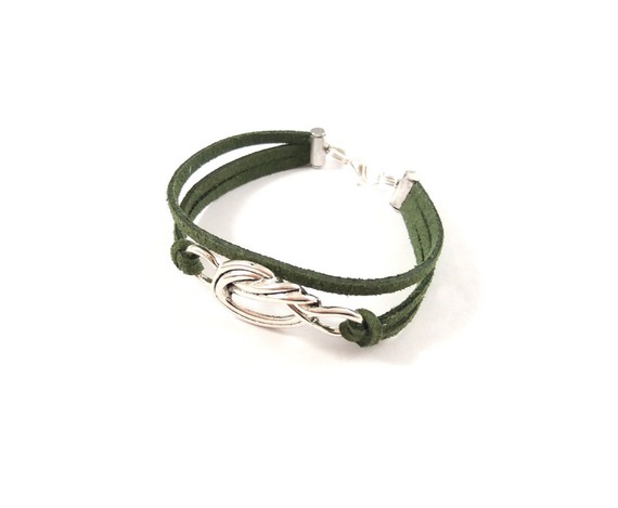 Bracelet pour femme. Les rubans sont en suédine couleur vert olive. Le fermoir mousqueton et les embouts sont en métal coloris argent.