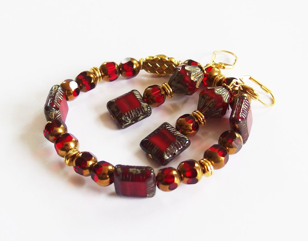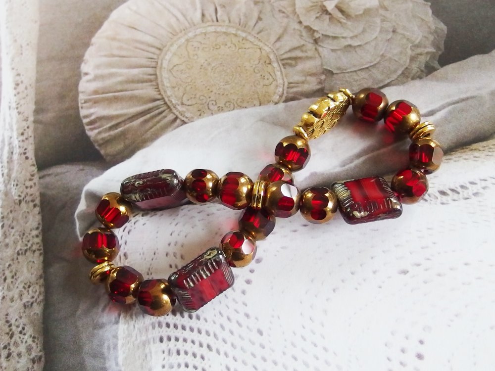 Belle harmonie dans les tons de rouge et d'or pour ce bracelet à l'esprit Edwardian début de siècle, avec de jolies perles en verre Tchèque polies au feu, perle et rondelles en métal doré