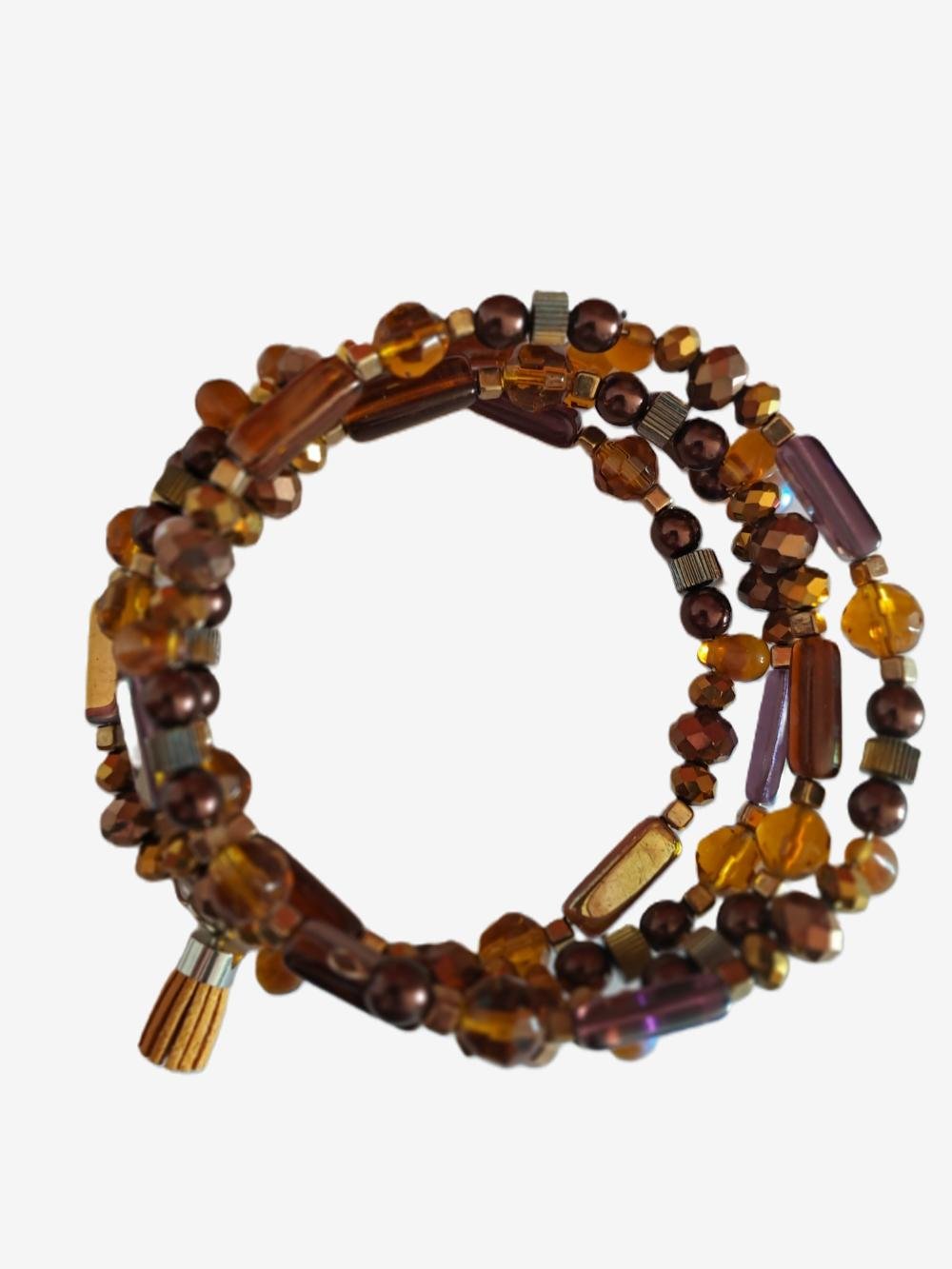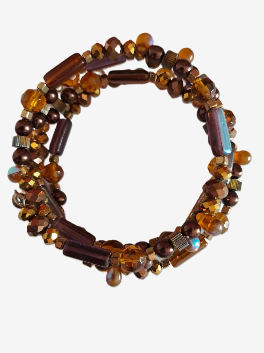 Création unique : bracelet à mémoire de forme dans des tons mordorés composé de perles de verre, de cristal, de perles magiques montées sur un fil en acier à mémoire de forme.