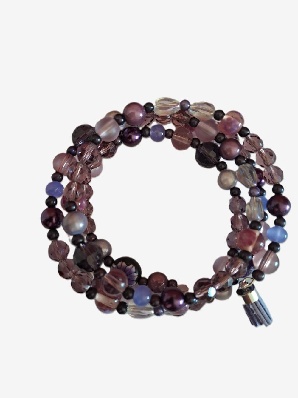 Création unique : bracelet à mémoire de forme, harmonie de violets composé de perles de verre, de cristal, de perles magiques montées sur un fil en acier à mémoire de forme.