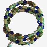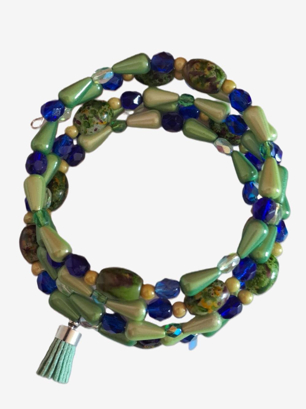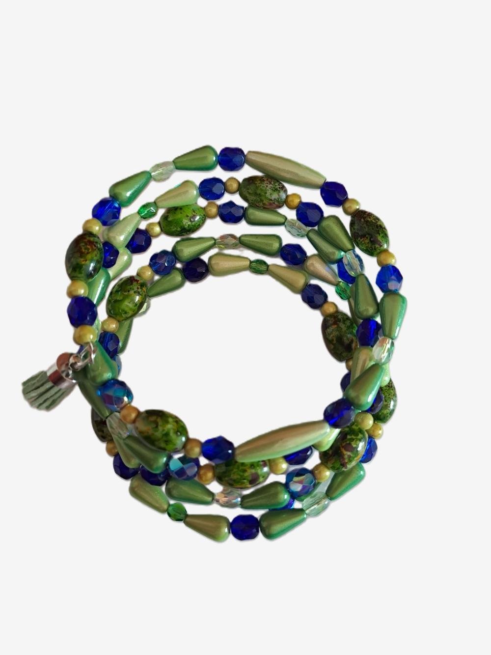 Création unique : bracelet à mémoire de forme dans des tons de vert et de bleu nuit composé de perles de verre, de cristal, de perles magiques montées sur un fil en acier à mémoire de forme.