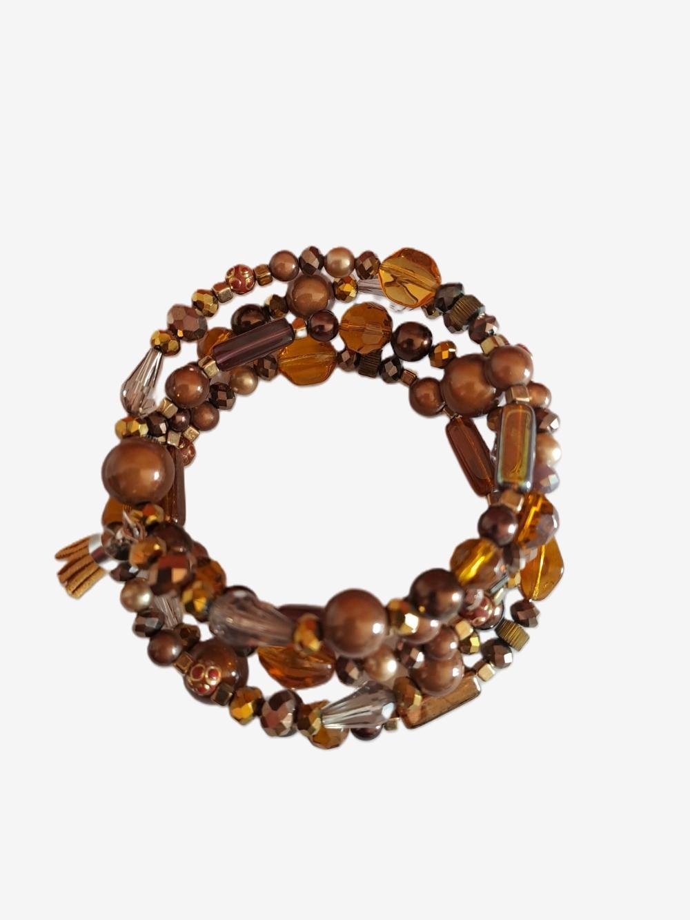 Création unique : bracelet à mémoire de forme dans des tons mordorés composé de perles de verre, de cristal, de perles magiques montées sur un fil en acier à mémoire de forme.