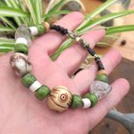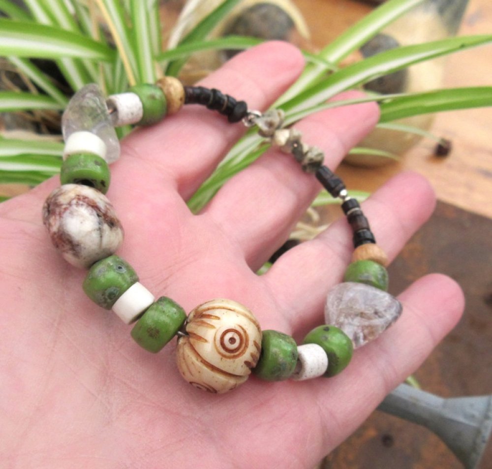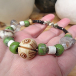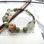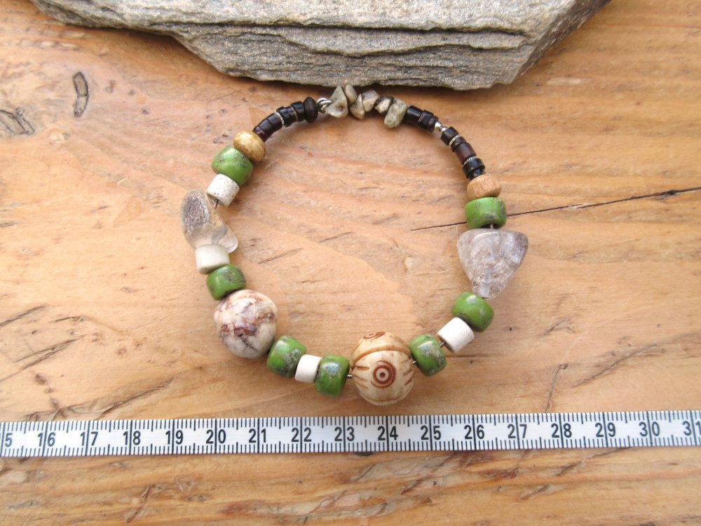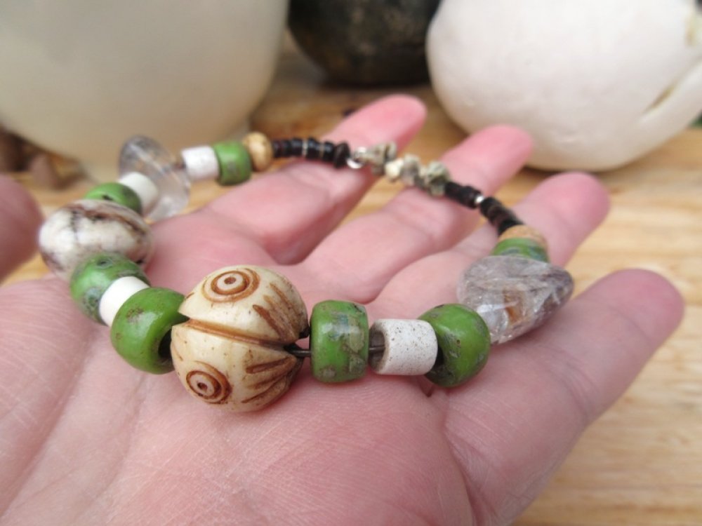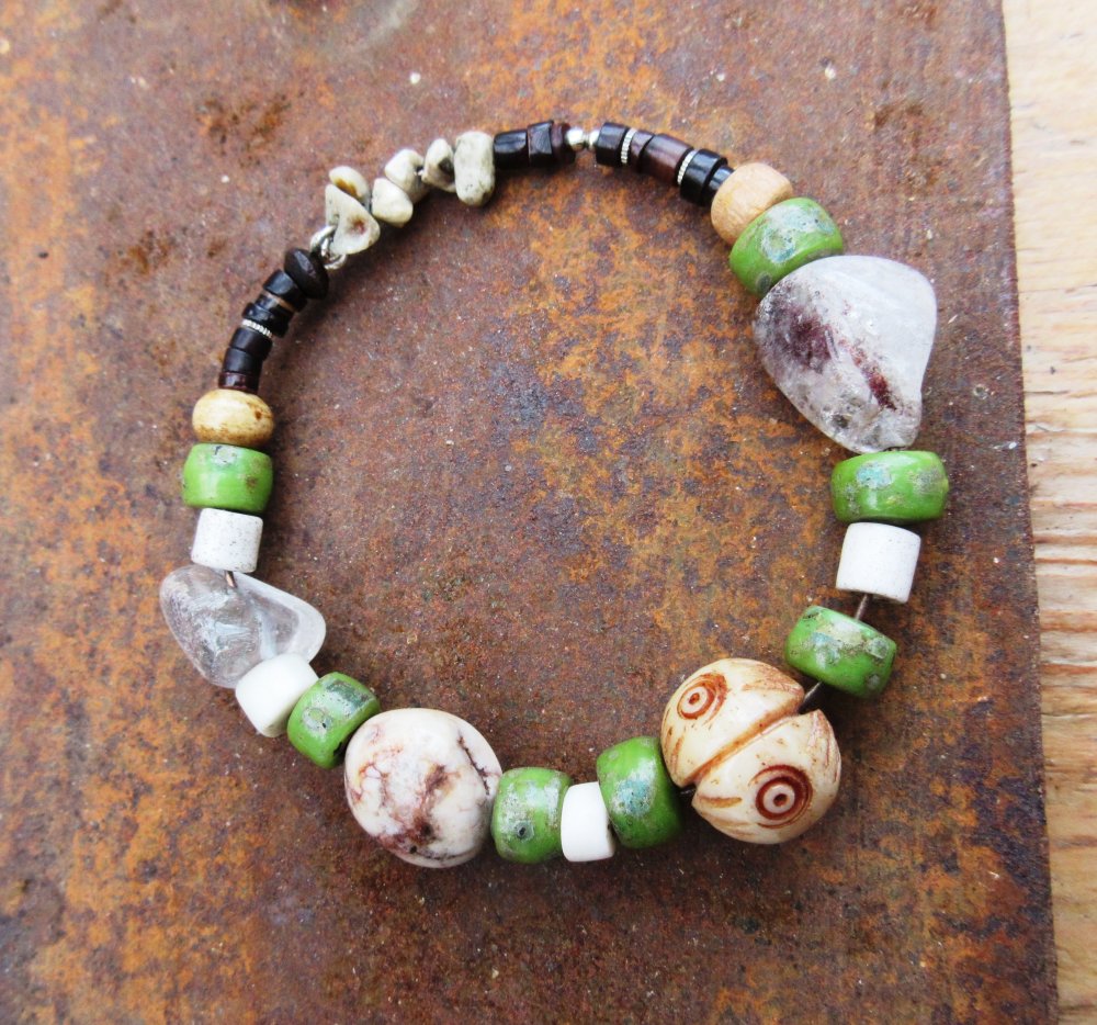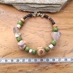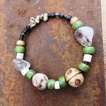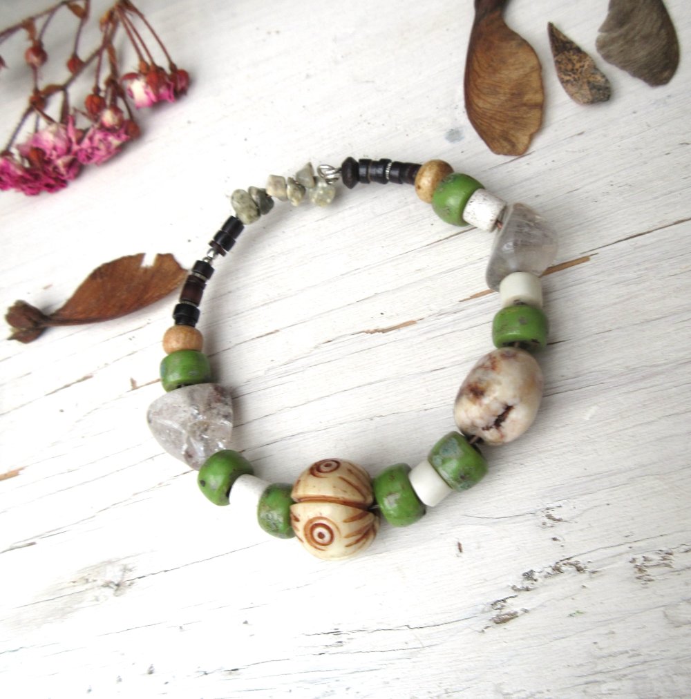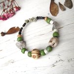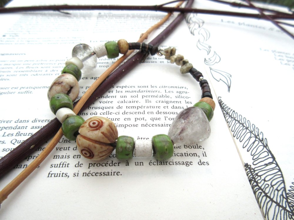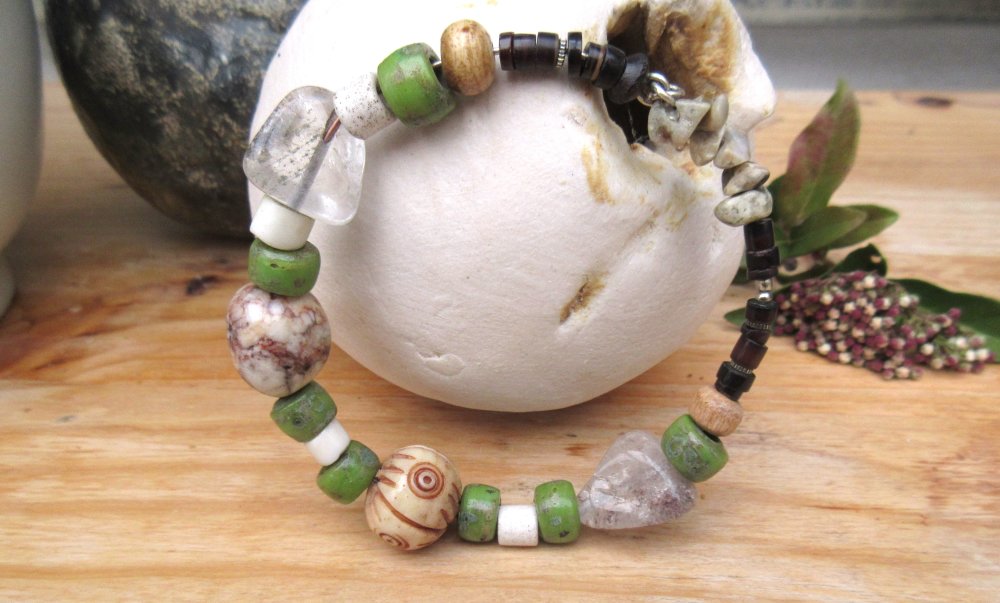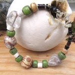 Un bracelet nomade, éclectique et semi-rigide : "Silence Nuancé:" : il est construit comme un petit grigris : toutes les perles sont montées sur fil d'acier : on y trouve : grosses perles en quartz lodolite -15/15 mm-, vieille agate, perle rare en os sculptée, perles en verre Picasso, perles en verre d'Afrique: African Trade Beads, rondelle en nacre, en argent plaqué, en bois, jaspe océan ...