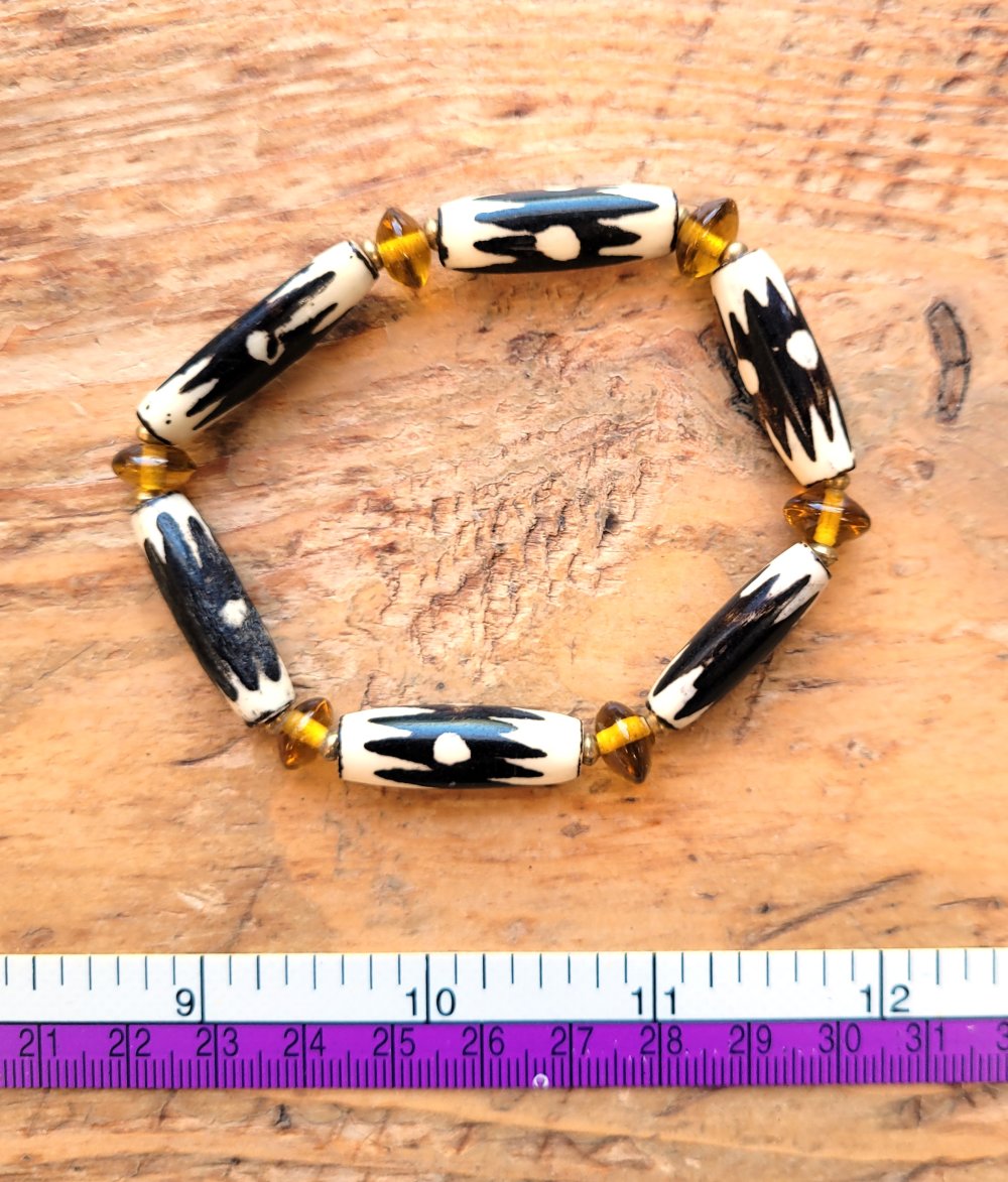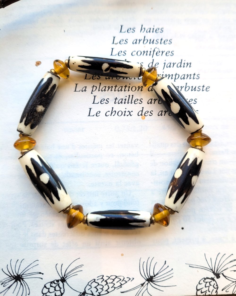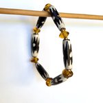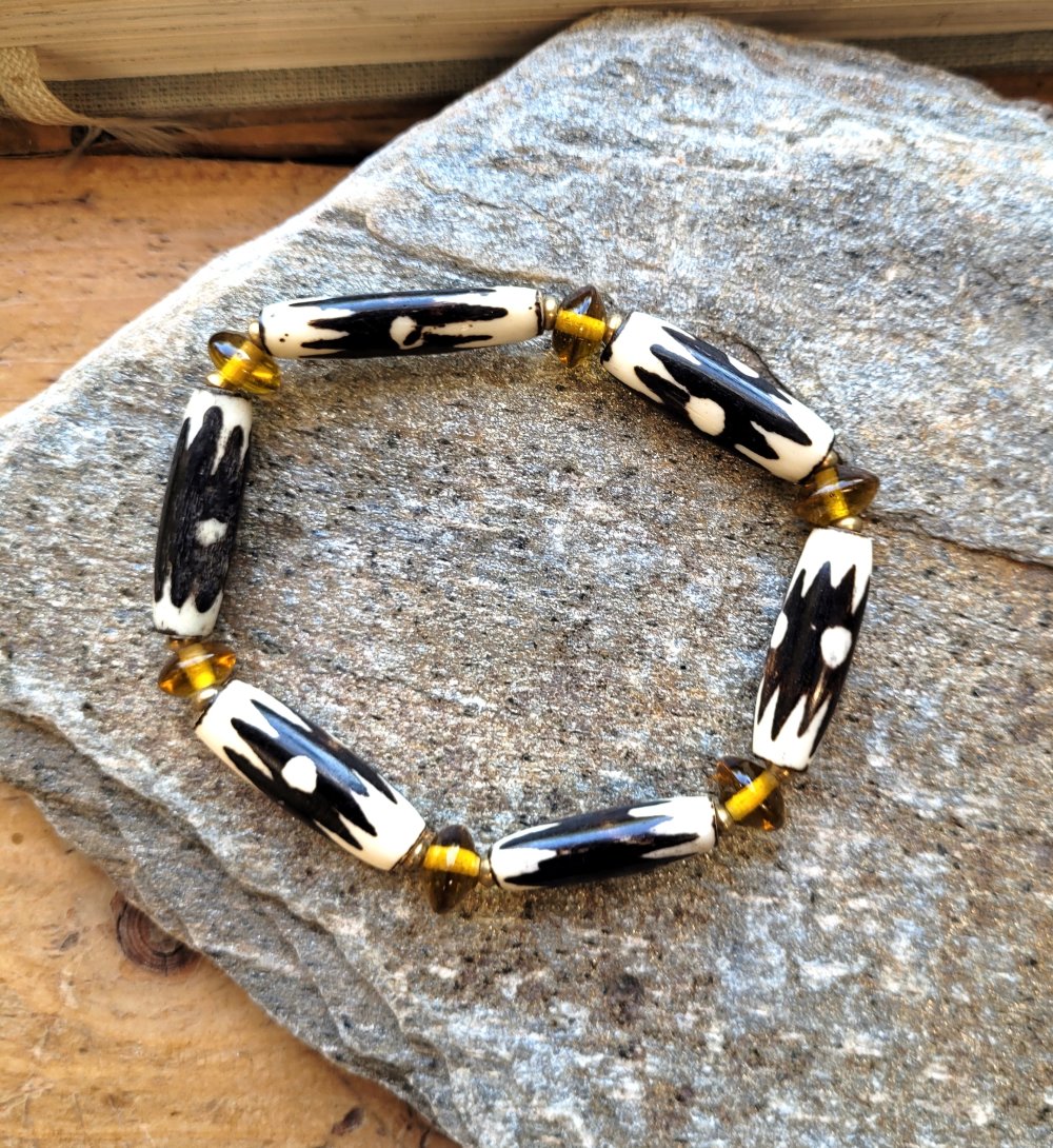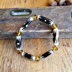 "Rythmes du Soudan" : un bracelet tribal unisexe ethnique ajustable monté sur gros lien élastique, perles anciennes en os batik , perles intercalaires laiton et perles soucoupe en verre jaune moutarde ..