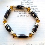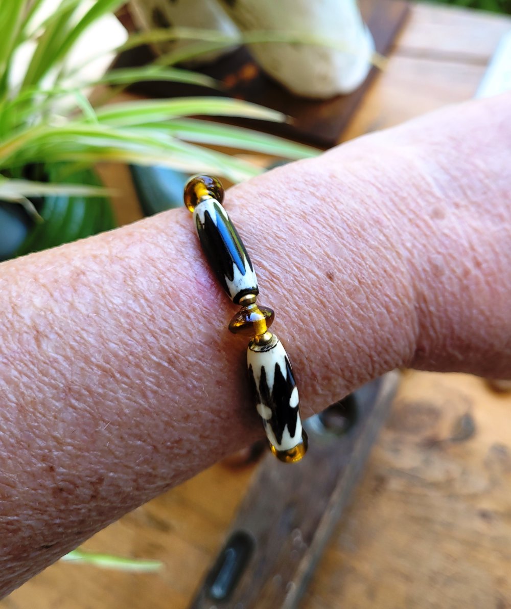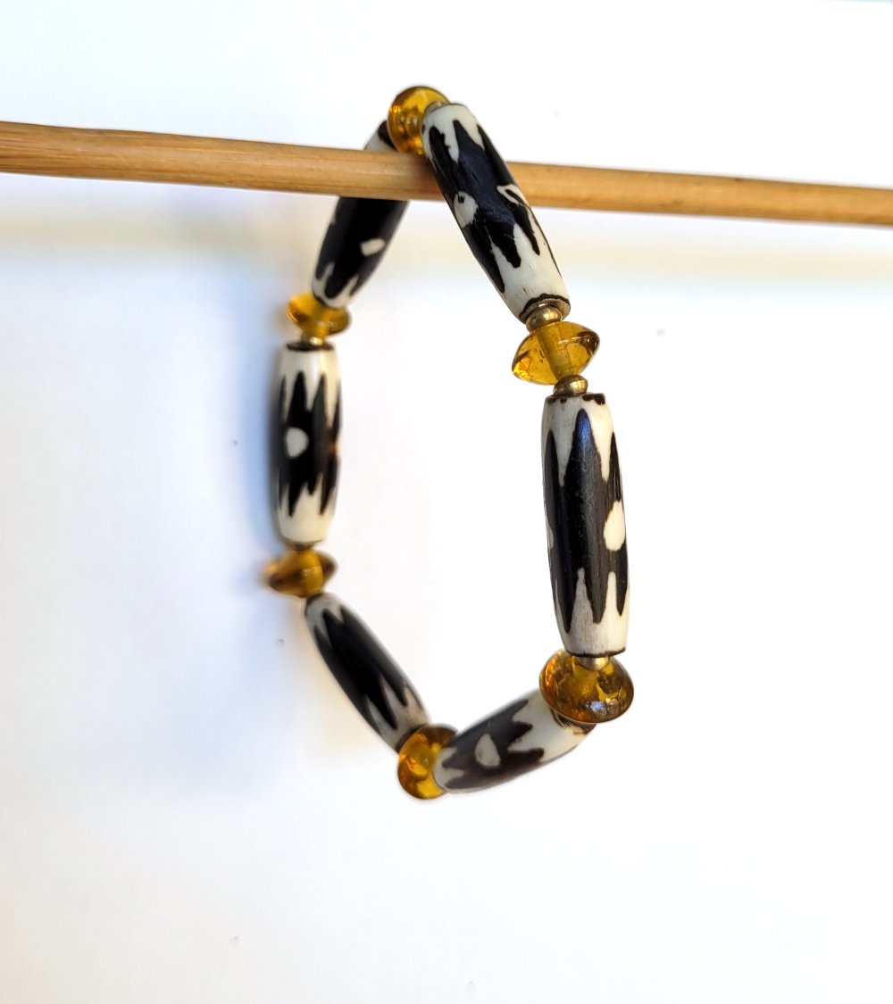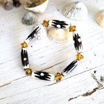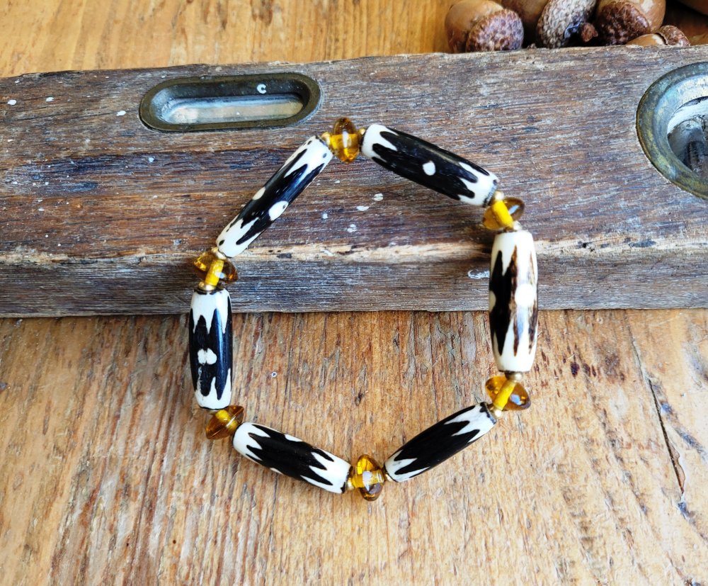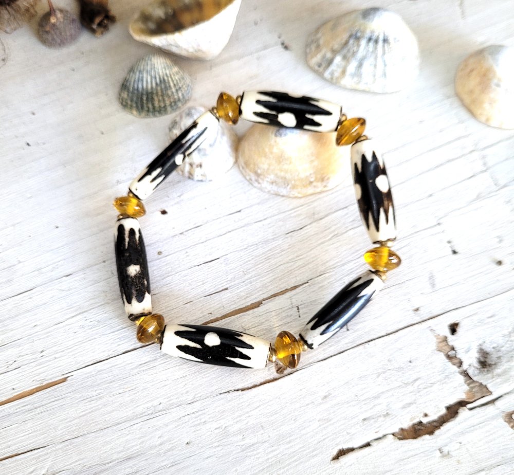 "Rythmes du Soudan" : un bracelet tribal unisexe ethnique ajustable monté sur gros lien élastique, perles anciennes en os batik , perles intercalaires laiton et perles soucoupe en verre jaune moutarde ..