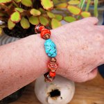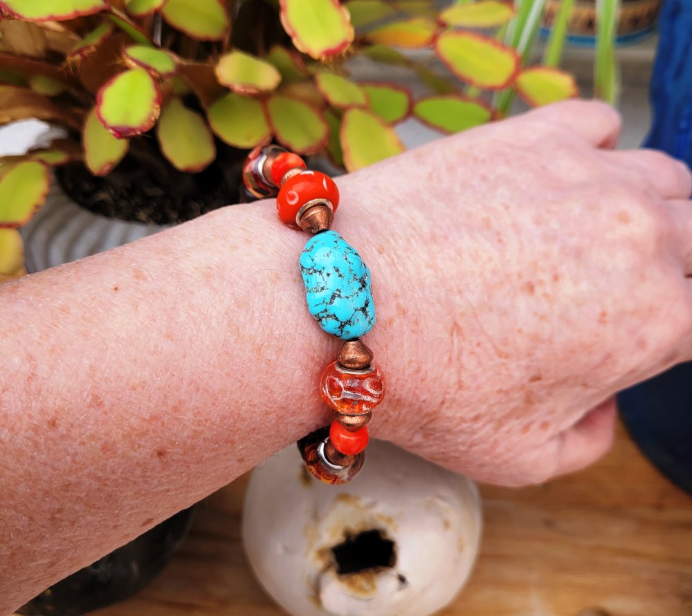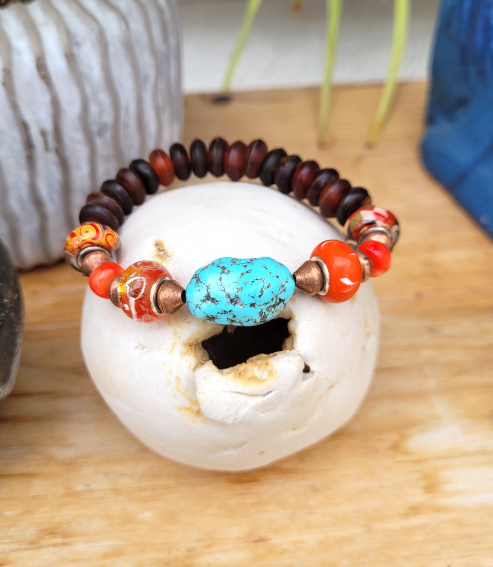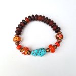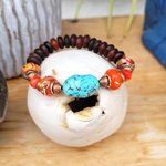 Monté sur un lien élastique pour plus de confort, il s’articule autour d’une majestueuse nugget de turquoise (24 x 15 mm), pierre centrale à la beauté brute et naturelle. Autour d’elle gravitent des perles soigneusement choisies :