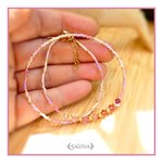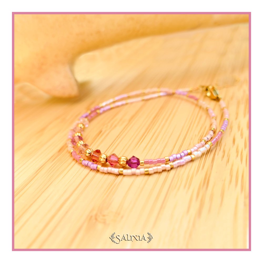 Bracelet double rang cristal de Swarovski et perles japonaises en dégradé de rose perles dorées à l'or fin fermoir et chainette d'extension en acier inoxydable doré.