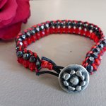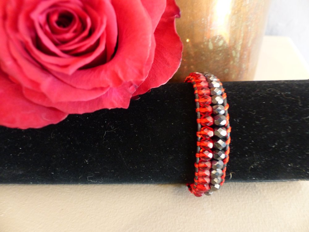 Ce bracelet wrap est tissé avec des perles à facettes rouges et noires.