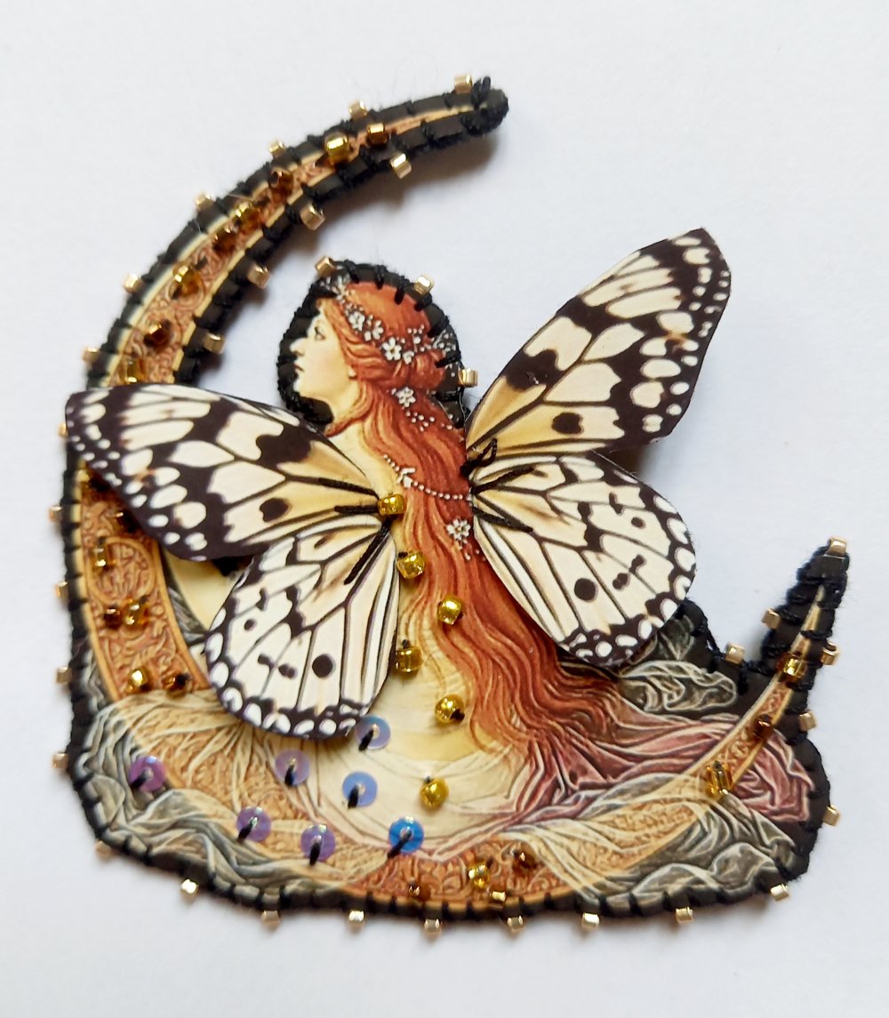 Broche, transfert textile haute résistance sur feutre.