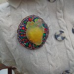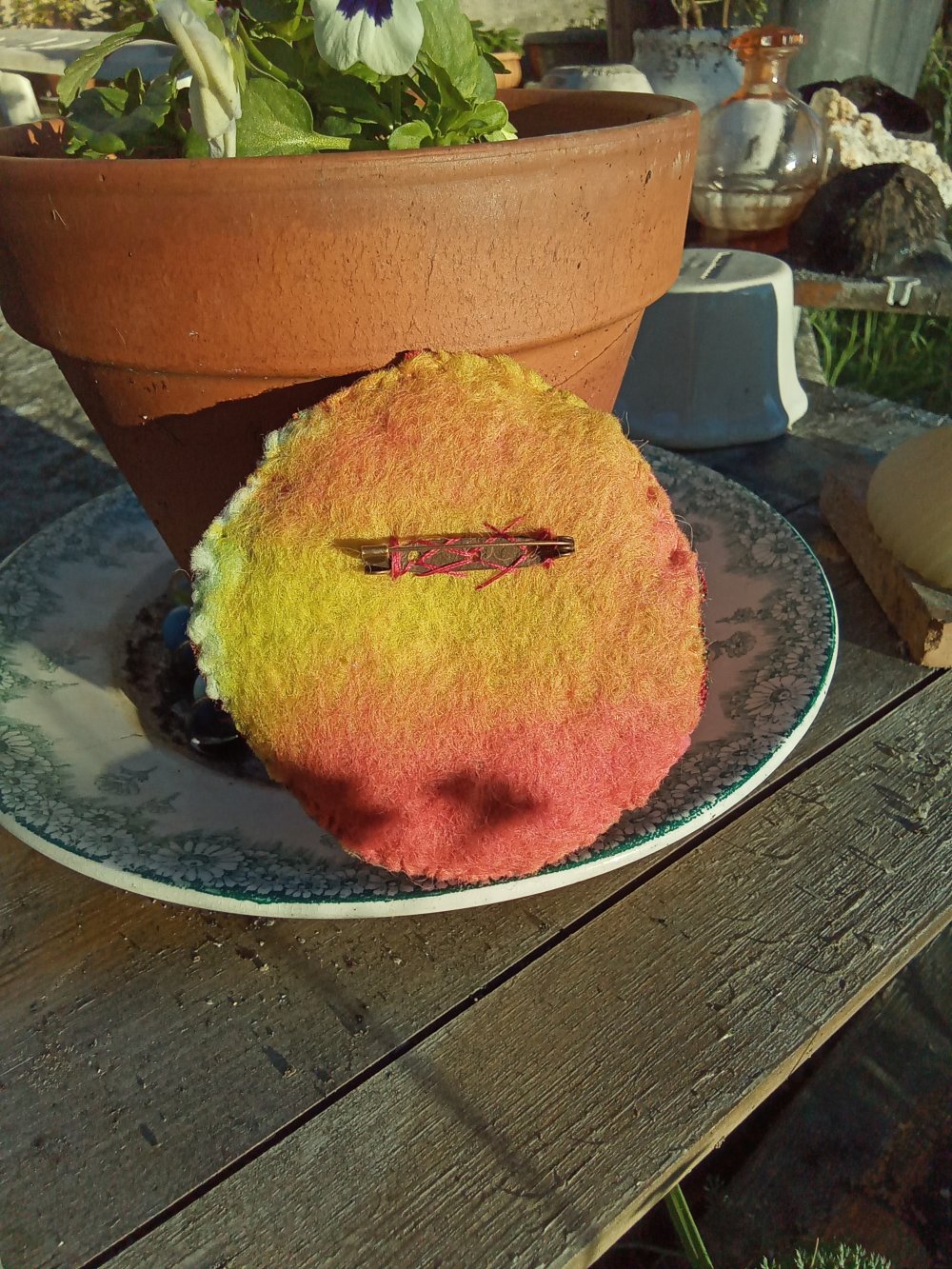 Et l'envers de la broche est une finition en feutre de dégrader jaune curry au orange où il y a une attache de broche cousue main.