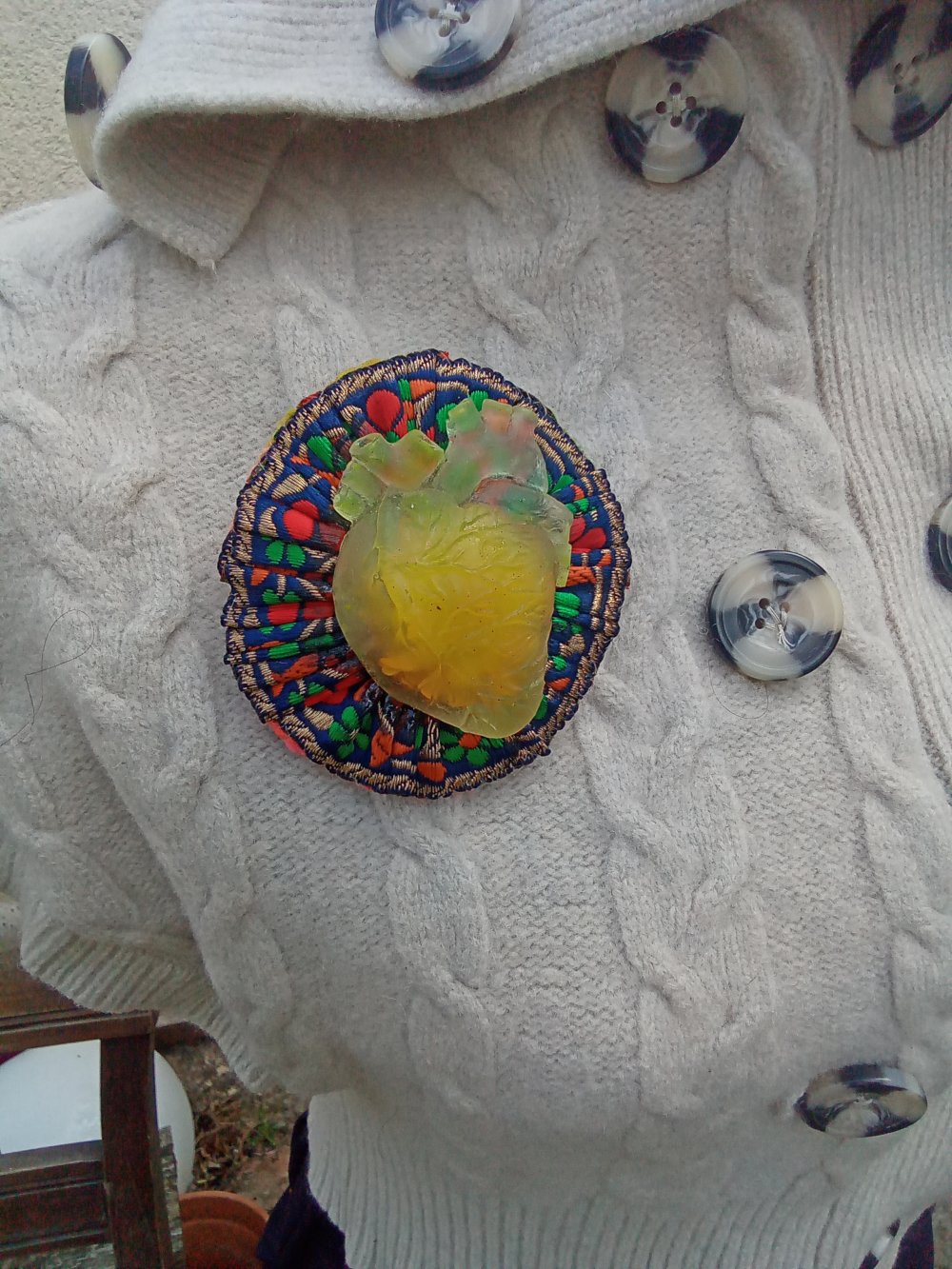 Broche avec un coeur atomique en résine de couleur jaune fluo.... Il y a une fleur séchée, une immortelle jaune.