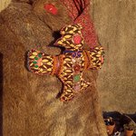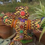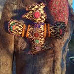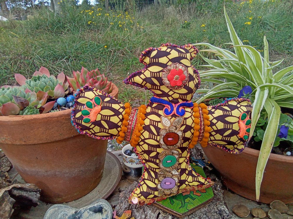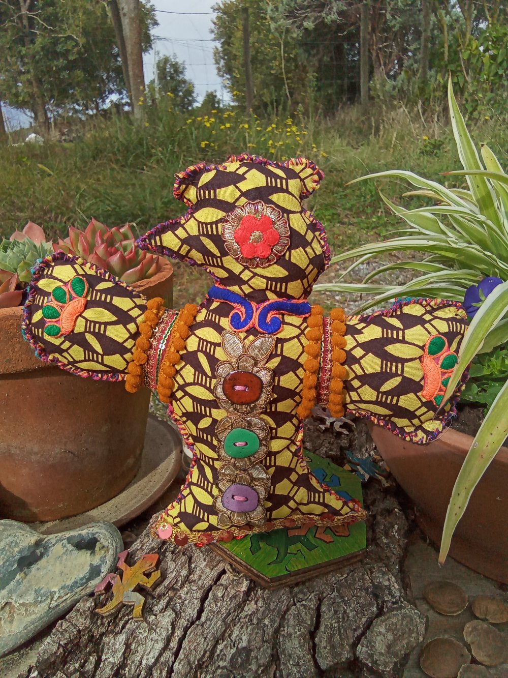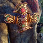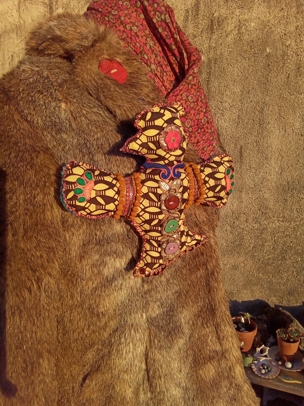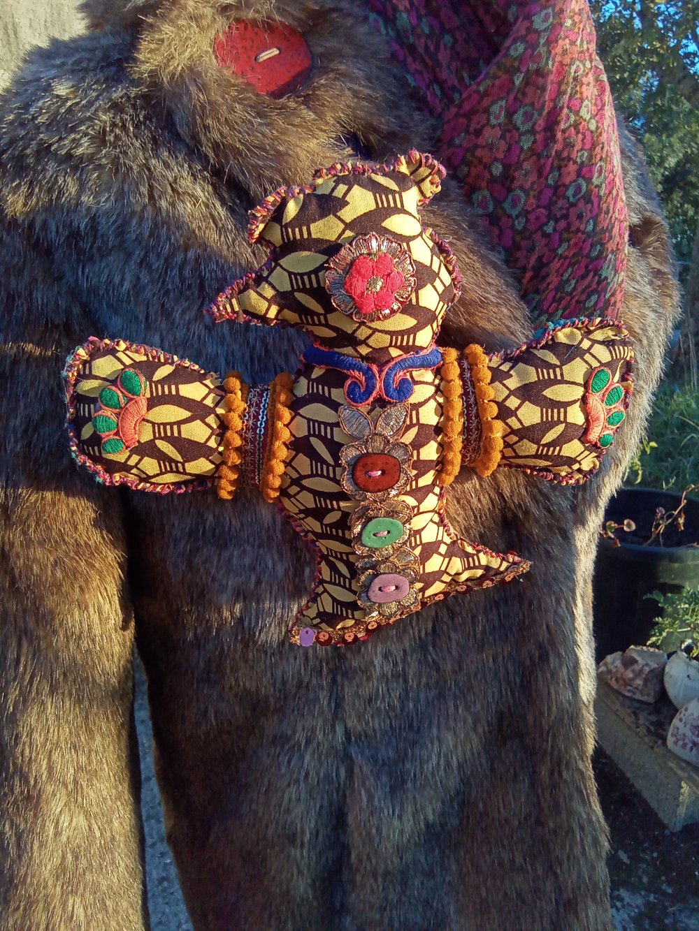 Elle est composée d'un tissu wax de couleurs Jaune Curry et Marron, de différentes broderies du Rajasthan colorées et trois boutons en émaux sur cuivre fauve, vert olive et prame clair.