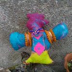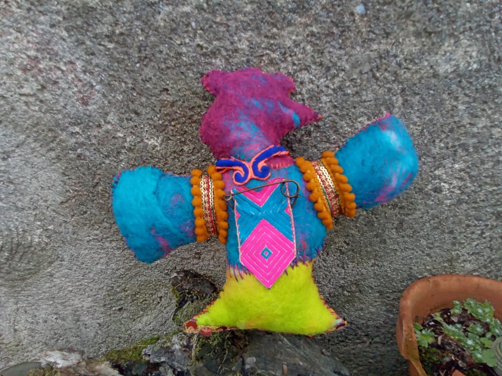 Son envers est en feutre de couleurs Turquoise, vert pomme et prune.
