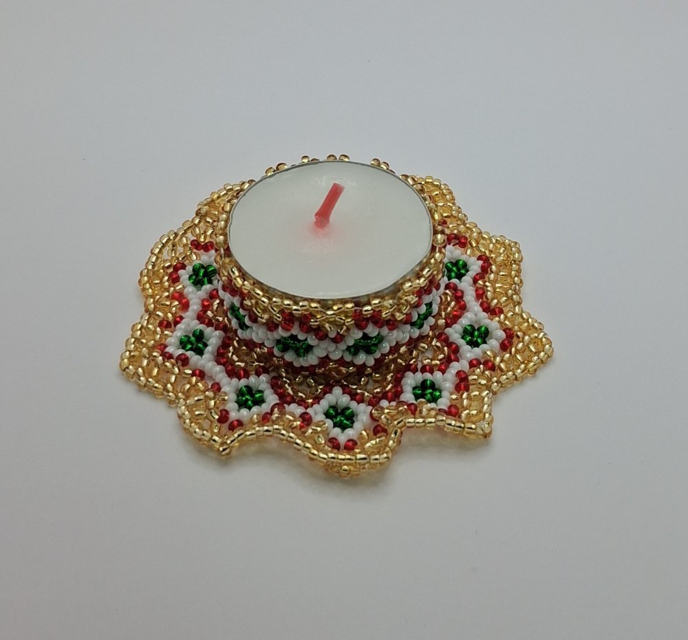 Apportez une touche de fête et d’élégance à votre table avec ce photophore délicatement tissé à la main avec des perles de rocaille. Idéal pour illuminer vos soirées d’hiver, décorer votre intérieur ou offrir un cadeau unique fait main.