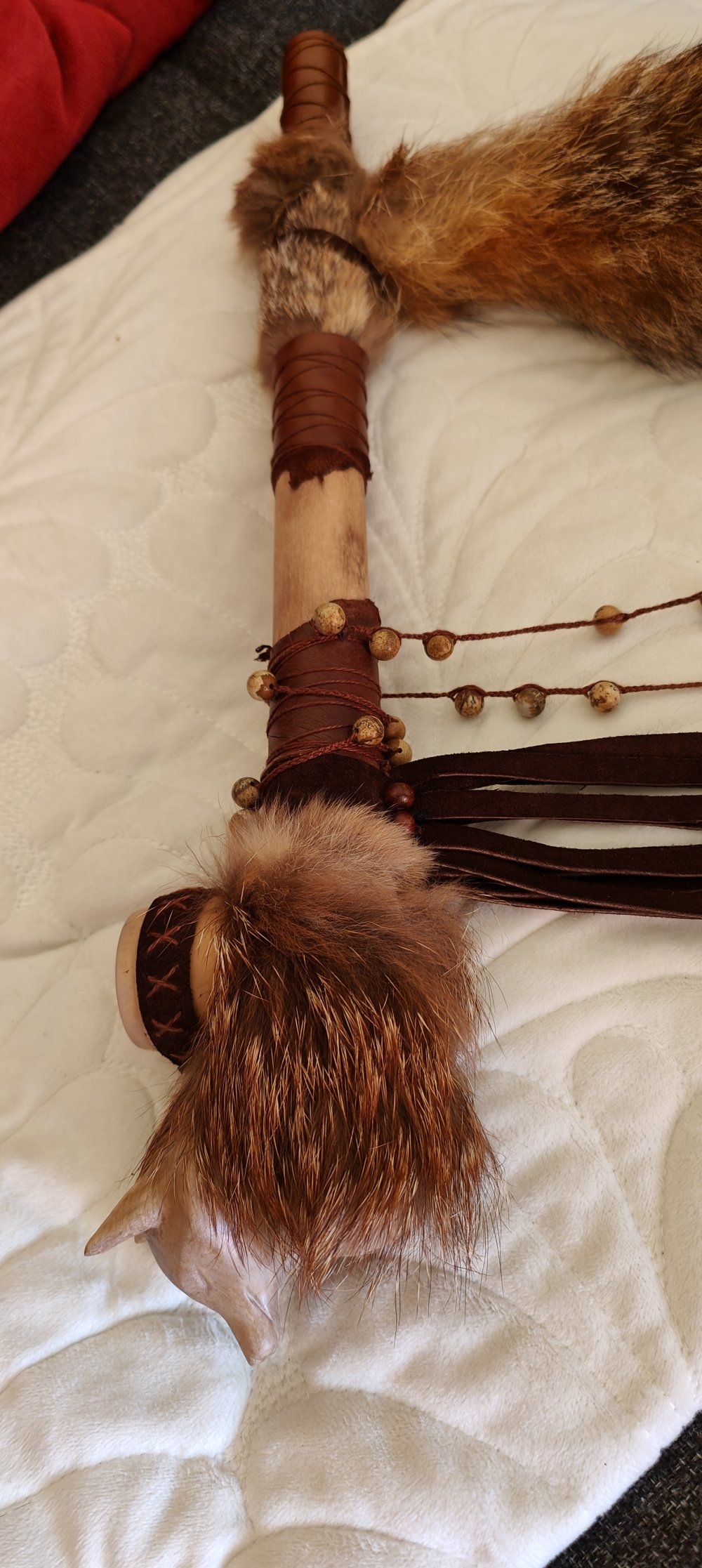 Base en bois, décorations en peau, queue et fourrure de renard, cuir , perles JASPE PAYSAGE et JASPE ROUGE.( 17H de travail )