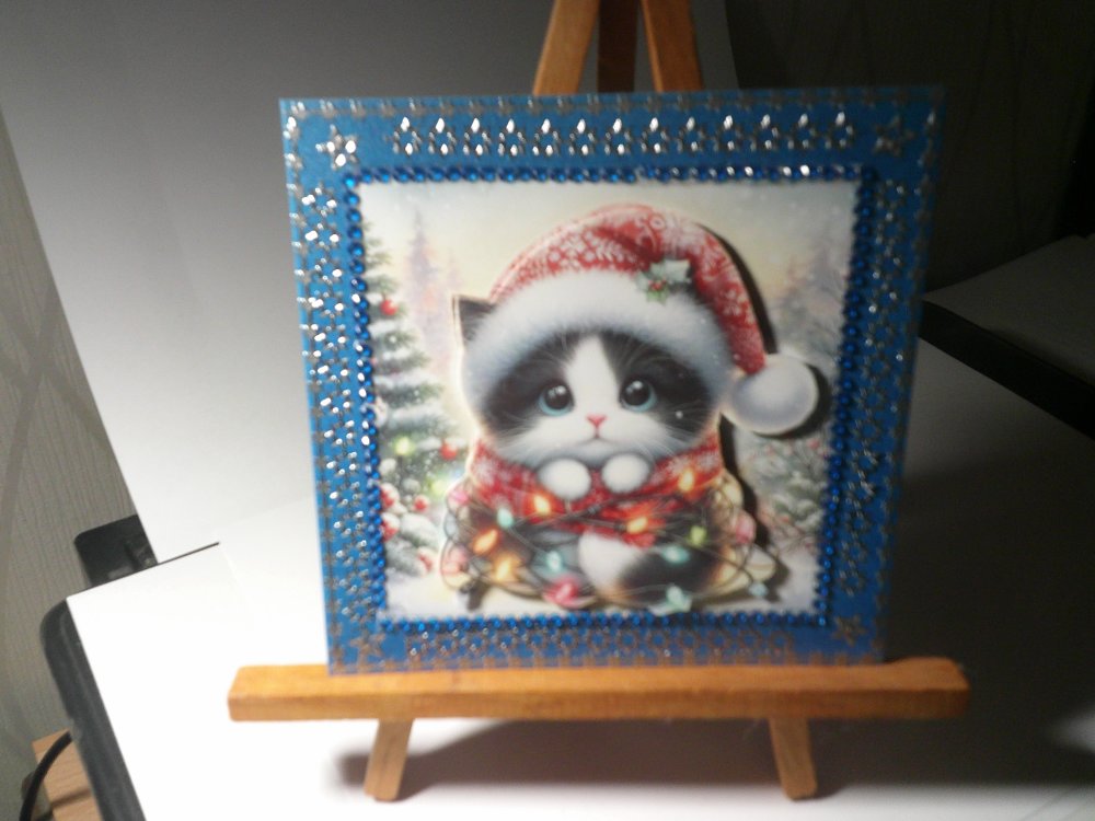 d'un motif en 3d représentant un mignon petit chat avec un bonnet de noel, et une guirlande électrique