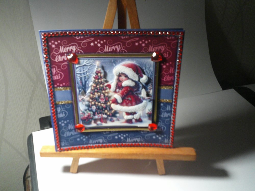 d'un motif en 3d représentant une magnifique fillette toute emmitouflée, bonnet bordé fourrure, manteau également et bottine, rouge et blanc, fillette décorant un sapin