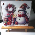 d'un motif en 3d représentant un bonhomme de neige avec son bonnet et son écharpe, de cadeaux de toutes tailles et d'une couronne de noel
