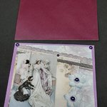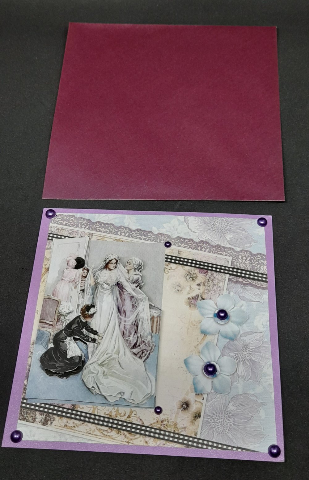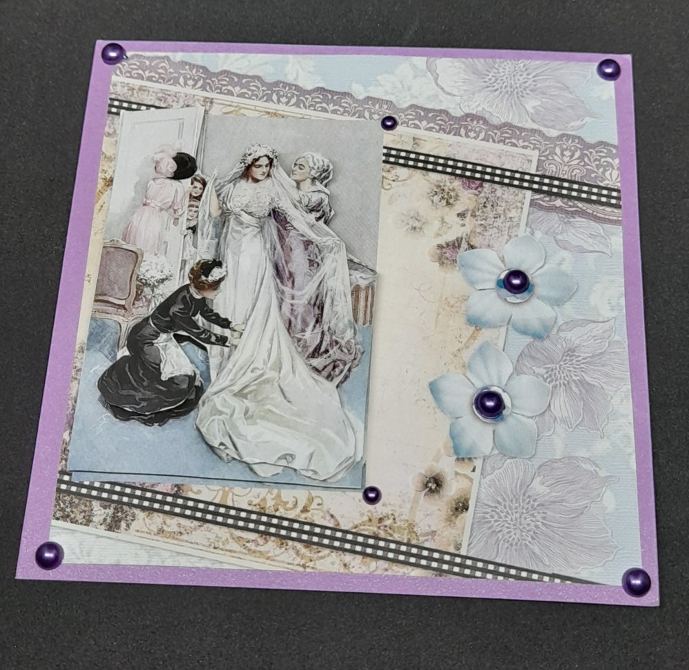 Offrez un instant de poésie avec cette carte pour un mariage romantique réalisée à la main. Sur un fond violet délicatement décoré, une jeune mariée s'empare de sa robe blanche. Les éléments en relief ajoutent profondeur et douceur, créant une scène chaleureuse.