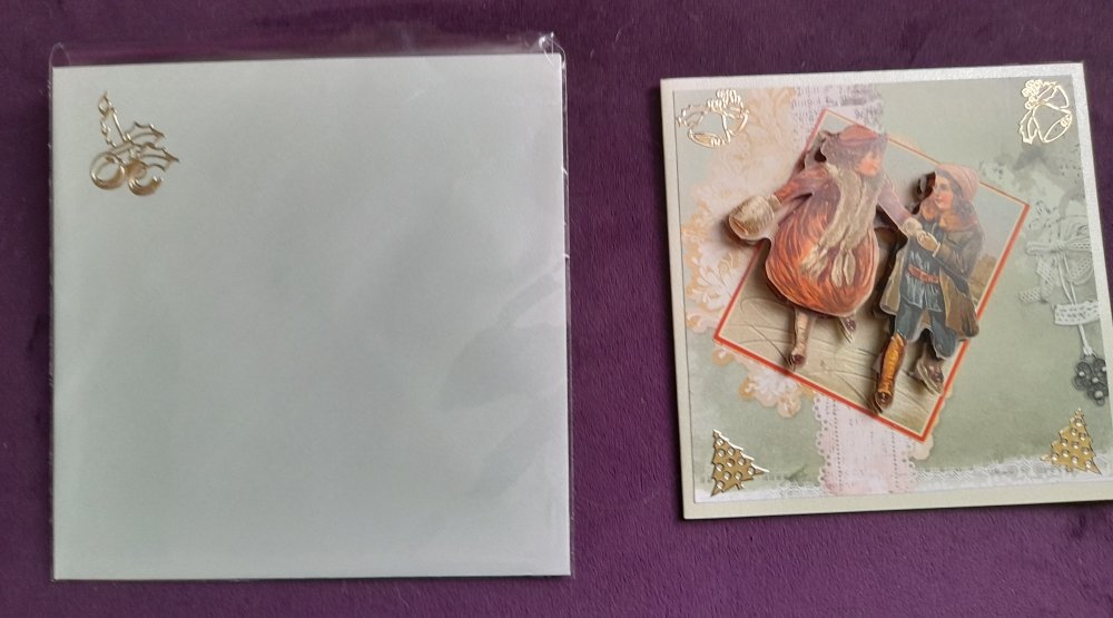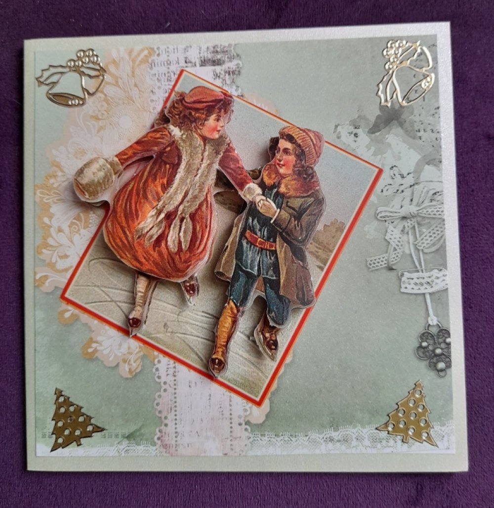 Offrez un instant de poésie avec cette carte pour Noël réalisée à la main. Sur un fond vert délicatement décoré, un deux jeunes gens patinent. Les éléments en relief ajoutent profondeur et douceur, créant une scène chaleureuse.