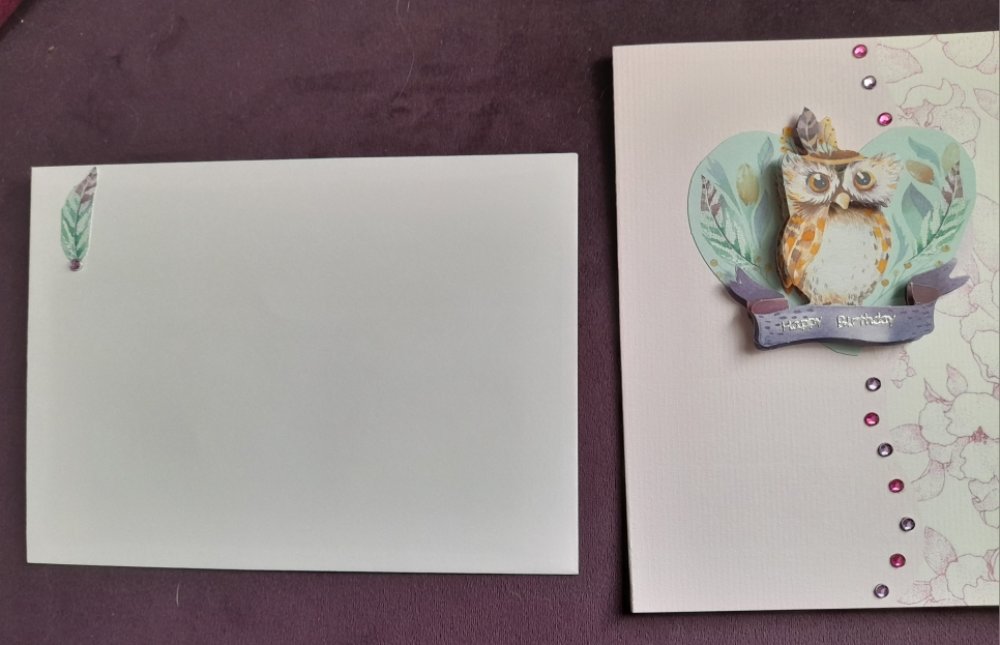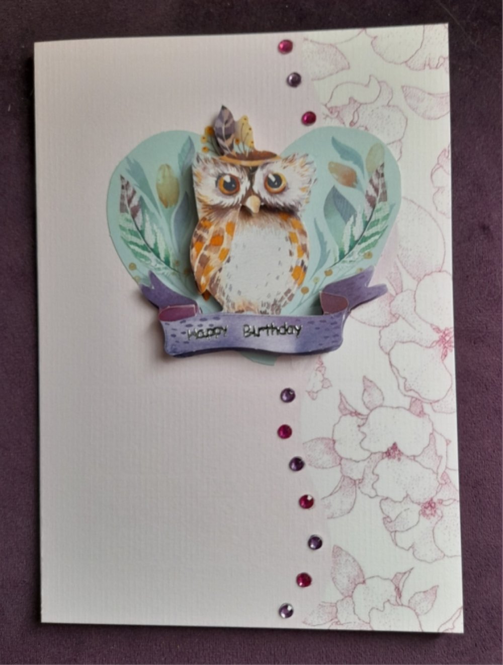 Offrez un instant de poésie avec cette carte pour un anniversaire féminin réalisée à la main. Sur un fond rosé délicatement décoré, se tient un petit hibou sur une branche. Les éléments en relief ajoutent profondeur et douceur, créant une scène chaleureuse.