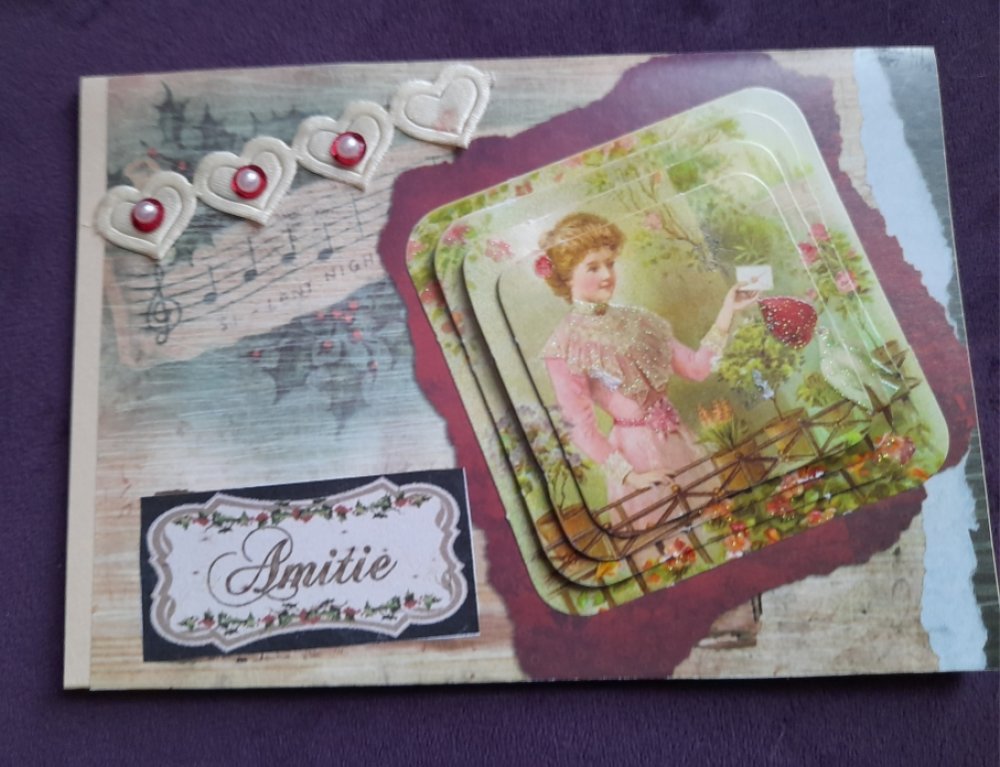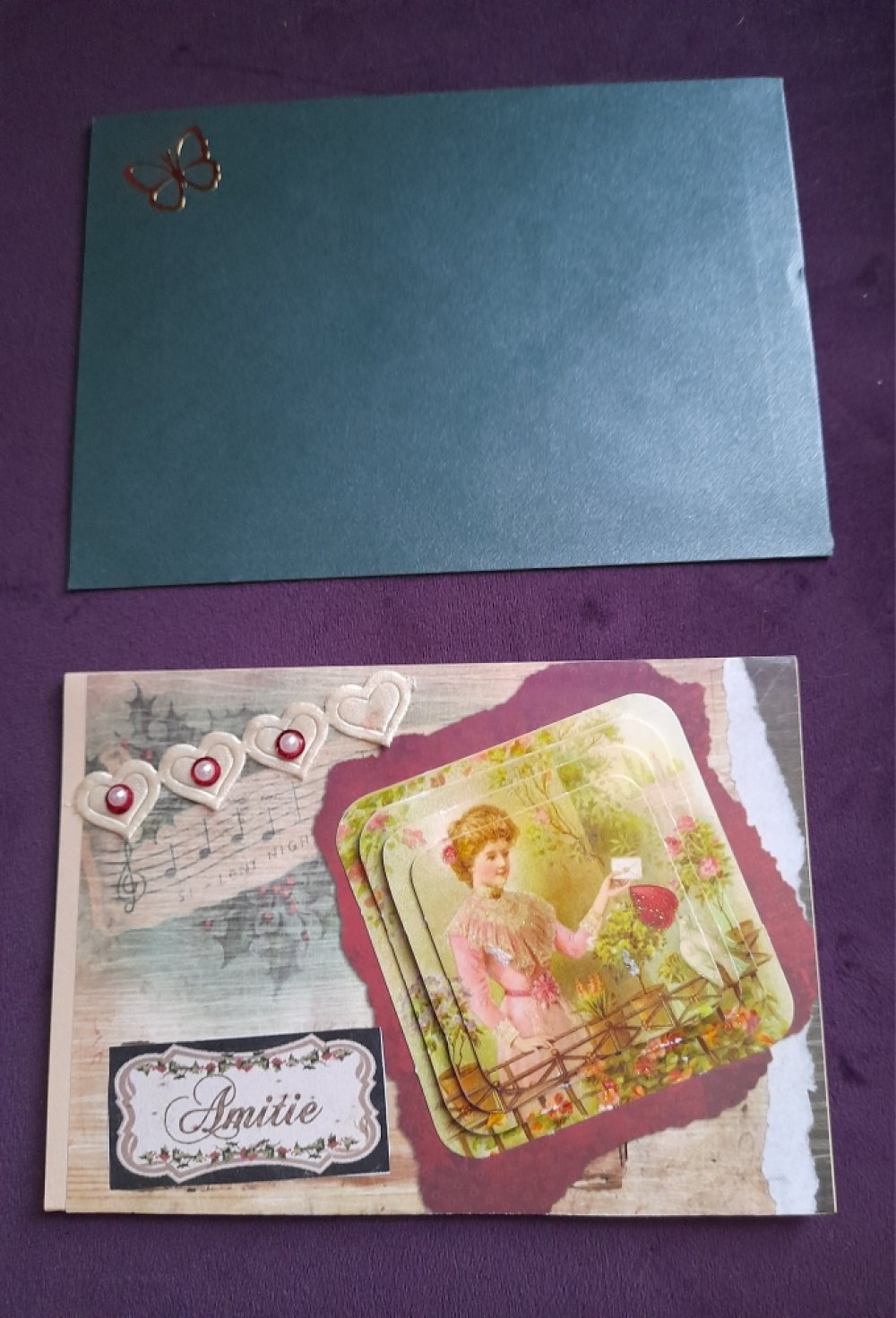 Offrez un instant de poésie avec cette carte pour une preuve d'amitié réalisée à la main. Sur un fond beige délicatement décoré, par une femme, les éléments en relief ajoutent profondeur et douceur, créant une scène chaleureuse.