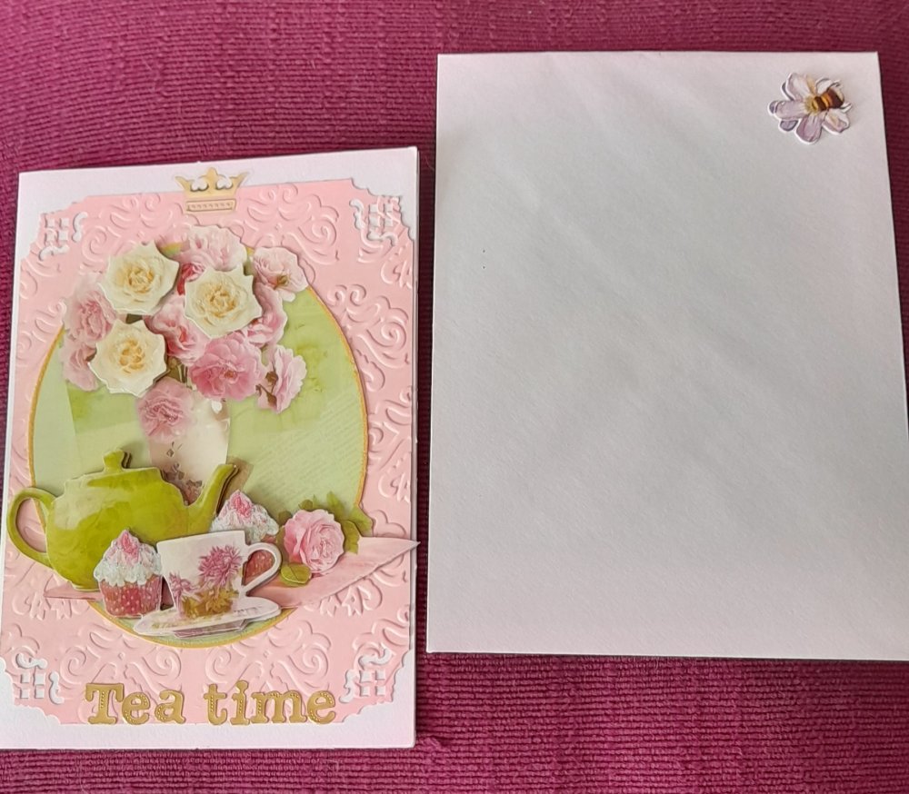 Offrez un instant de poésie avec cette carte pour une preuve d'amitié réalisée à la main. Sur un fond blanc délicatement décoré, par un moment de tea time, les éléments en relief ajoutent profondeur et douceur, créant une scène chaleureuse.