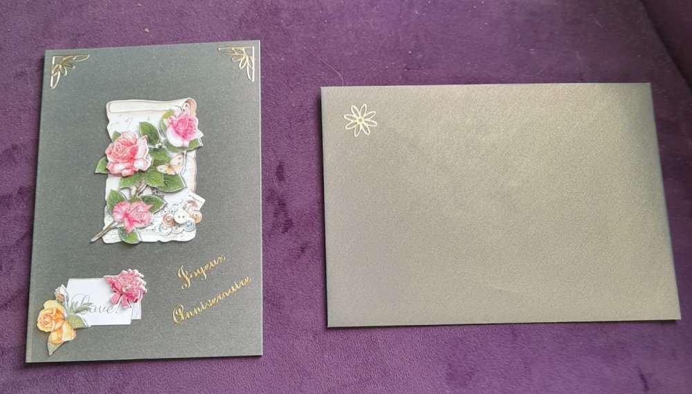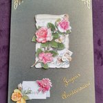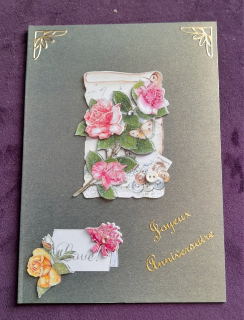 Offrez un instant de poésie avec cette carte d'anniversaire aux teintes douces et harmonieuses réalisée à la main. Sur un fond vert pailleté délicatement décoré, une étiquette anciennes est décorée de roses. Les éléments en relief ajoutent profondeur et douceur, créant une scène bucolique.