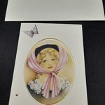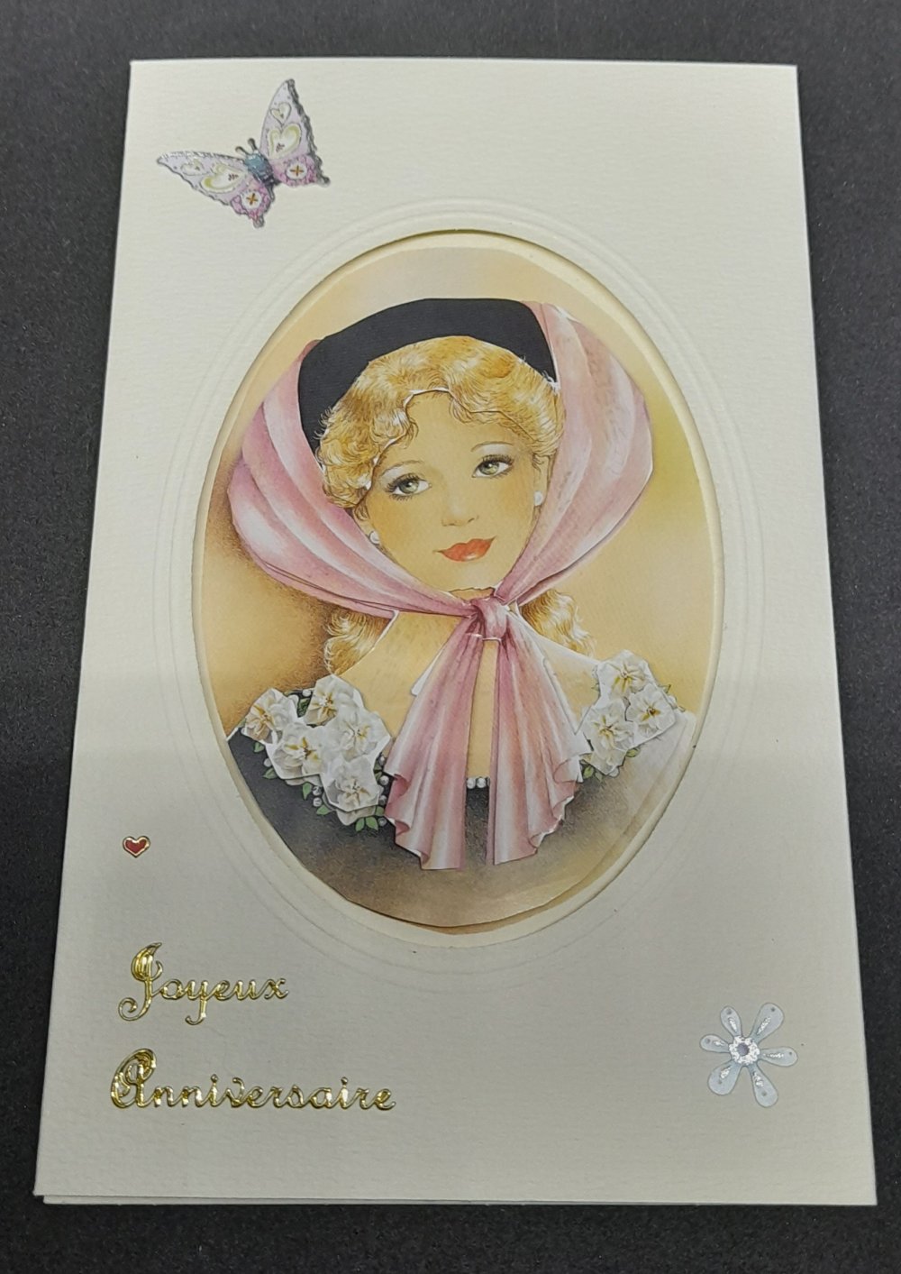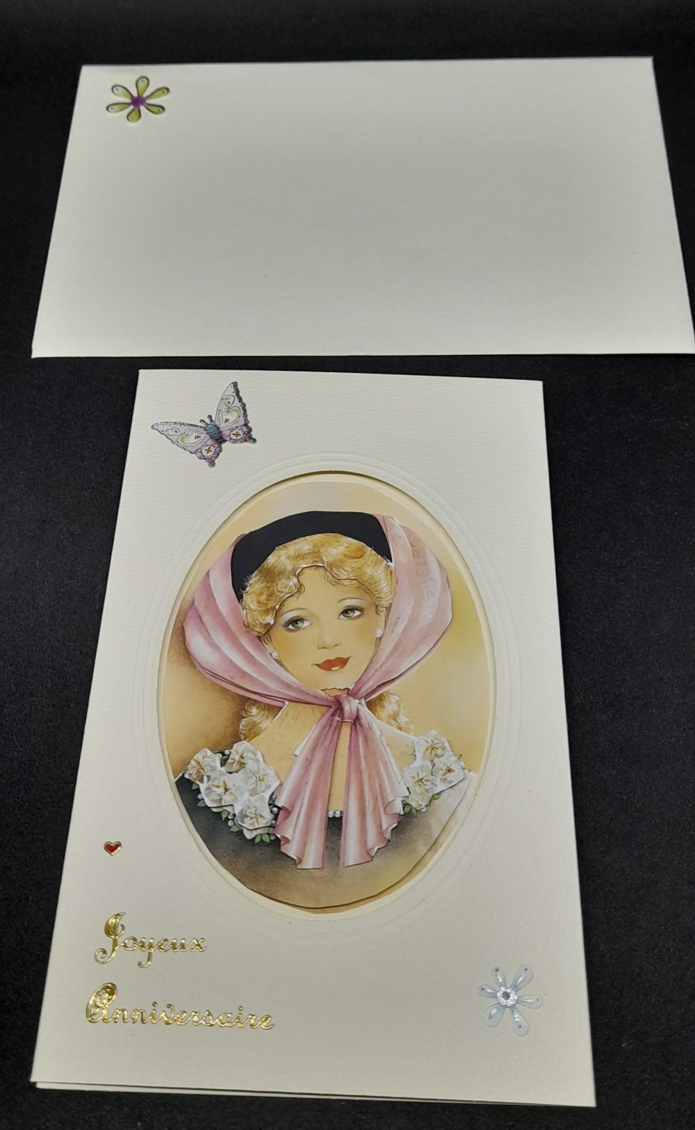 Offrez un instant de poésie avec cette carte pour un anniversaire réalisée à la main. Sur un fond écru délicatement décoré, une jeune femme au chapeau nous sourit. Les éléments en relief ajoutent profondeur et douceur, créant une scène chaleureuse.