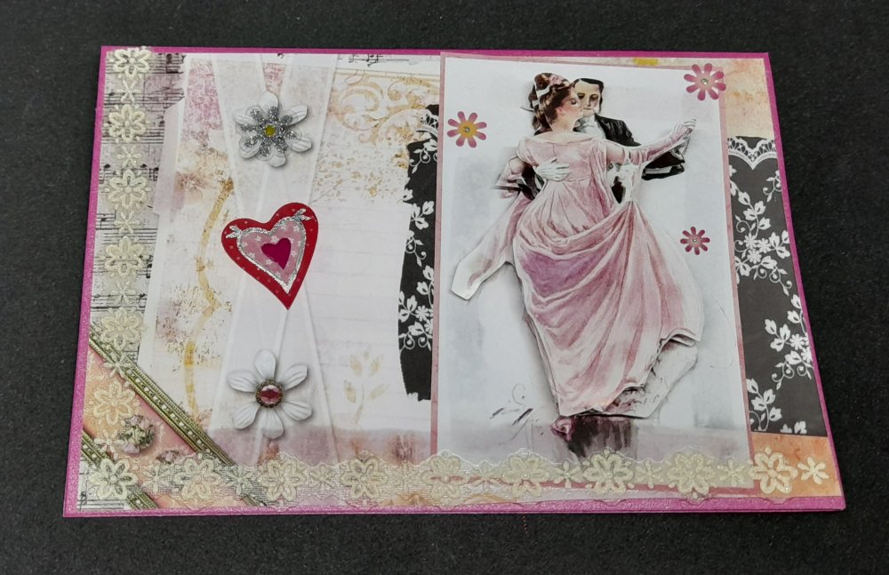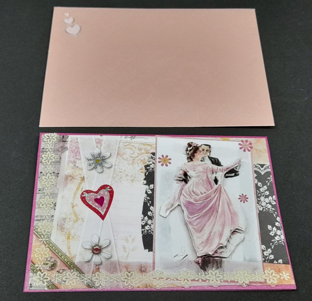 Offrez un instant de poésie avec cette carte pour un mariage romantique réalisée à la main. Sur un fond rose délicatement décoré, un couple de jeunes mariés dansent. Les éléments en relief ajoutent profondeur et douceur, créant une scène chaleureuse.