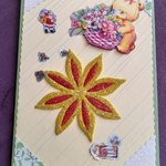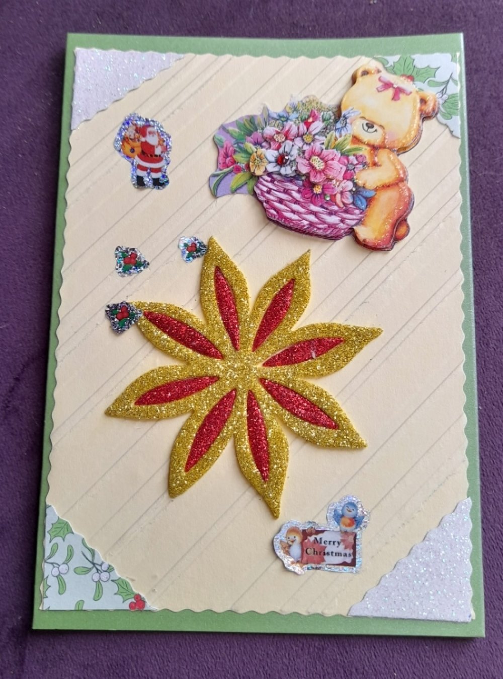 Offrez un instant de poésie avec cette carte pour Noël réalisée à la main. Sur un fond vert délicatement décoré, petit ours porte un panier. Les éléments en relief ajoutent profondeur et douceur, créant une scène chaleureuse.