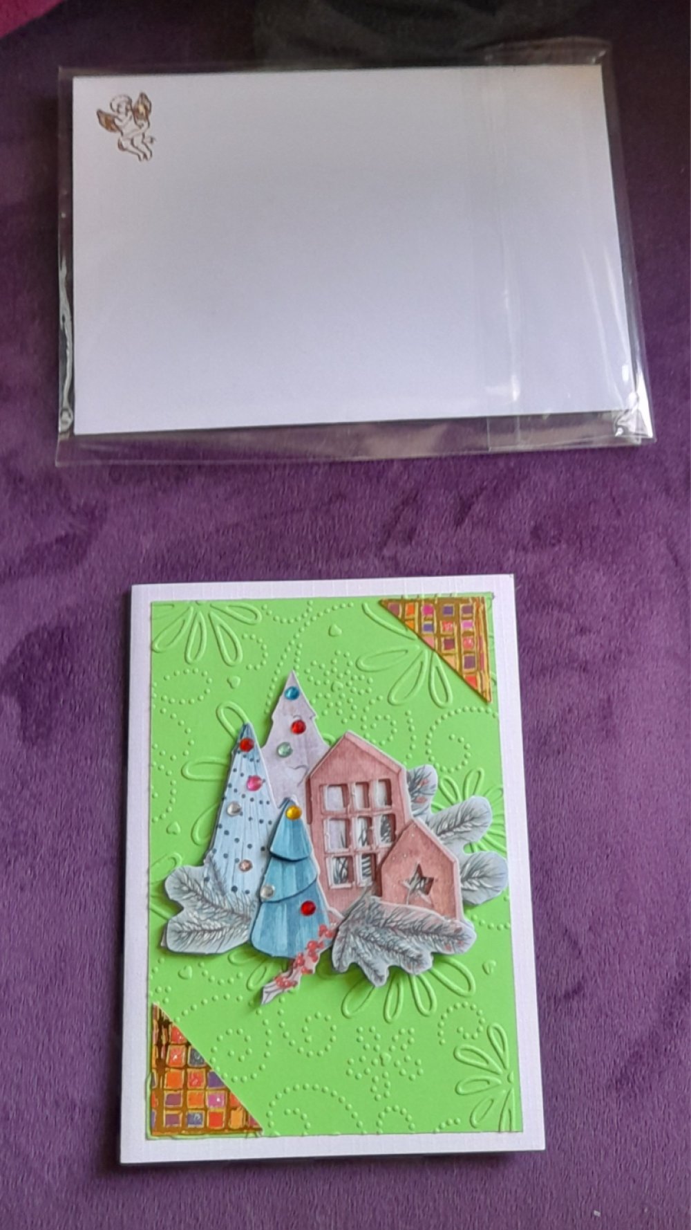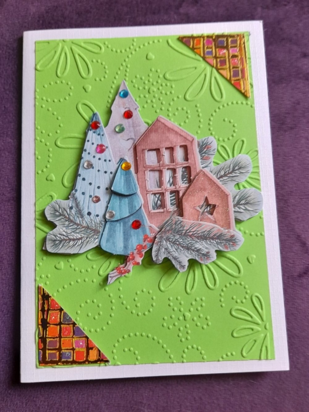 Offrez un instant de poésie avec cette carte de Noël romantique réalisée à la main. Sur un fond blanc délicatement décoré, se tient des sapins. Les éléments en relief ajoutent profondeur et douceur, créant une scène chaleureuse.