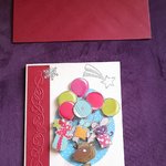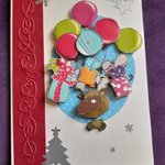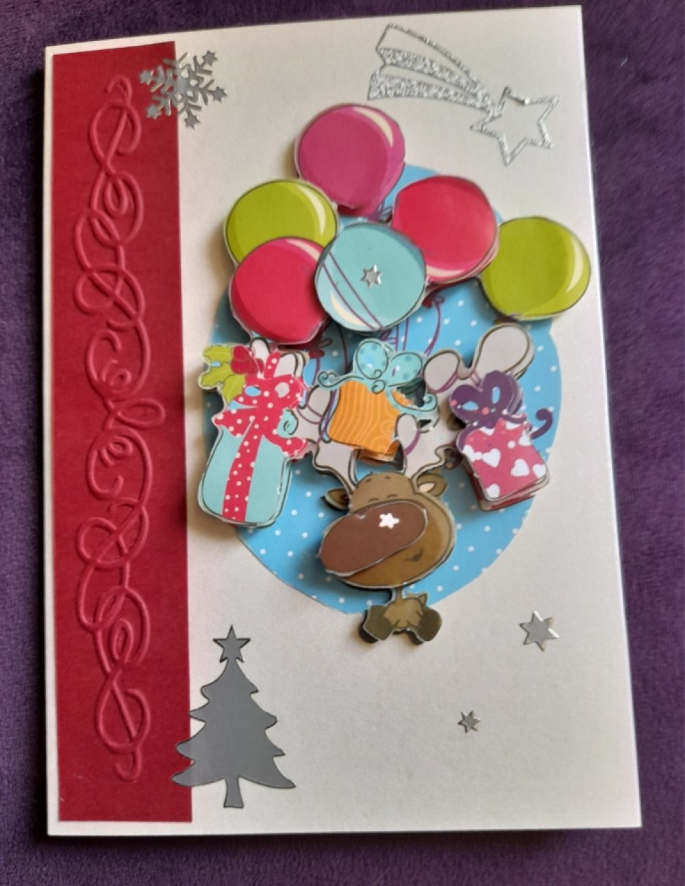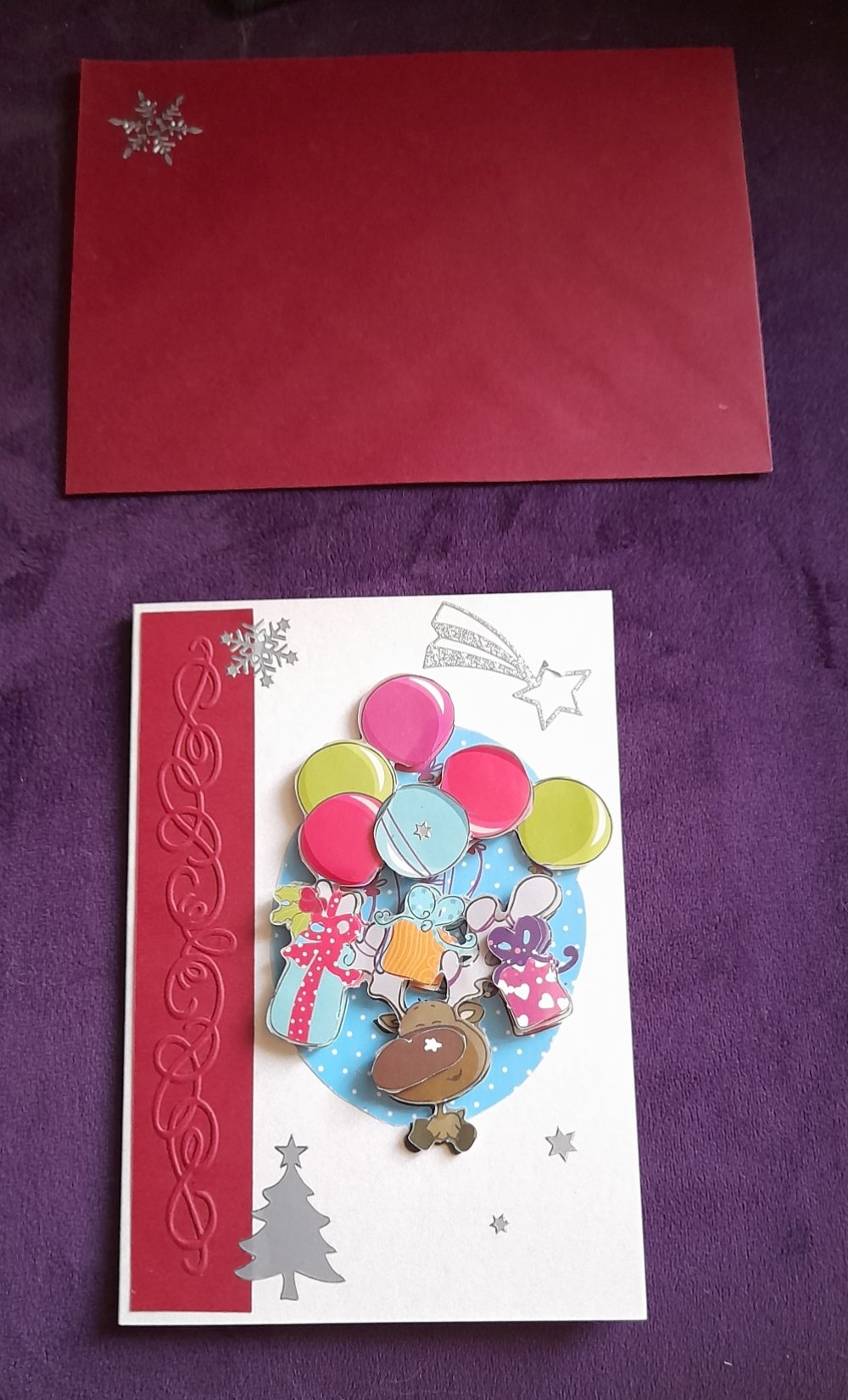 Offrez un instant de poésie avec cette carte de Noël romantique réalisée à la main. Sur un fond écru délicatement décoré, un renne s'envole avec des ballons. Les éléments en relief ajoutent profondeur et douceur, créant une scène chaleureuse.