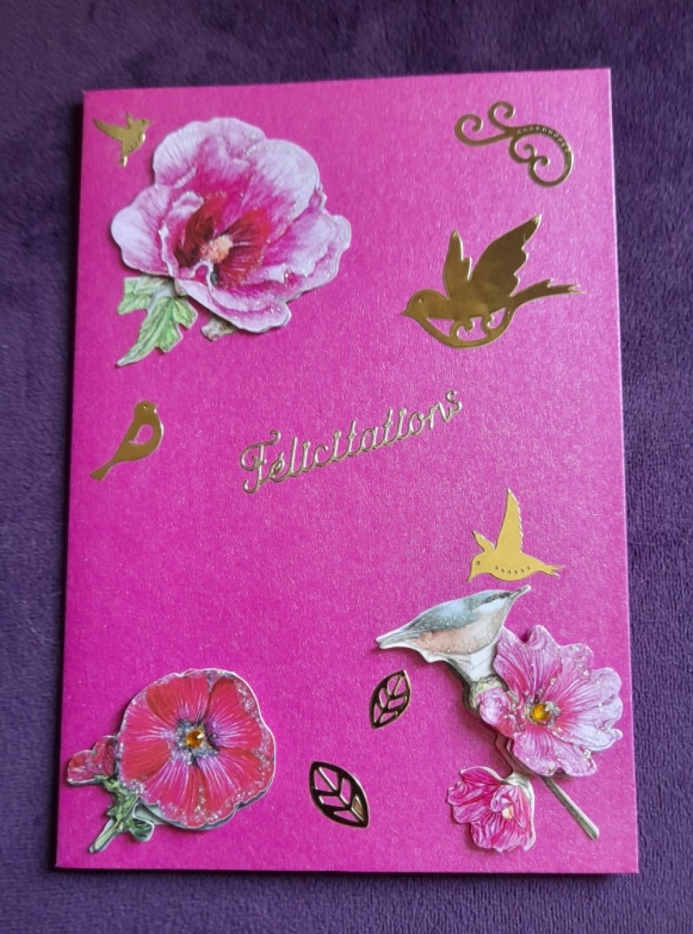 Offrez un instant de poésie avec cette carte de félicitations aux teintes douces et harmonieuses réalisée à la main. Sur un fond fuchsia pailleté délicatement décoré, se trouve des fleurs . Les éléments en relief ajoutent profondeur et douceur, créant une scène bucolique.