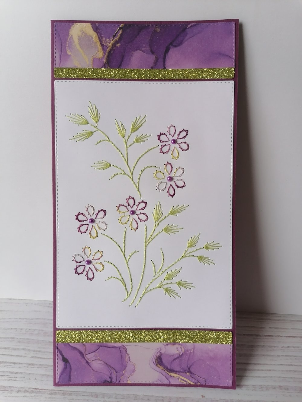 Carte double base prune, 10,5 x 21 cm brodée de fleurs mauve et anis