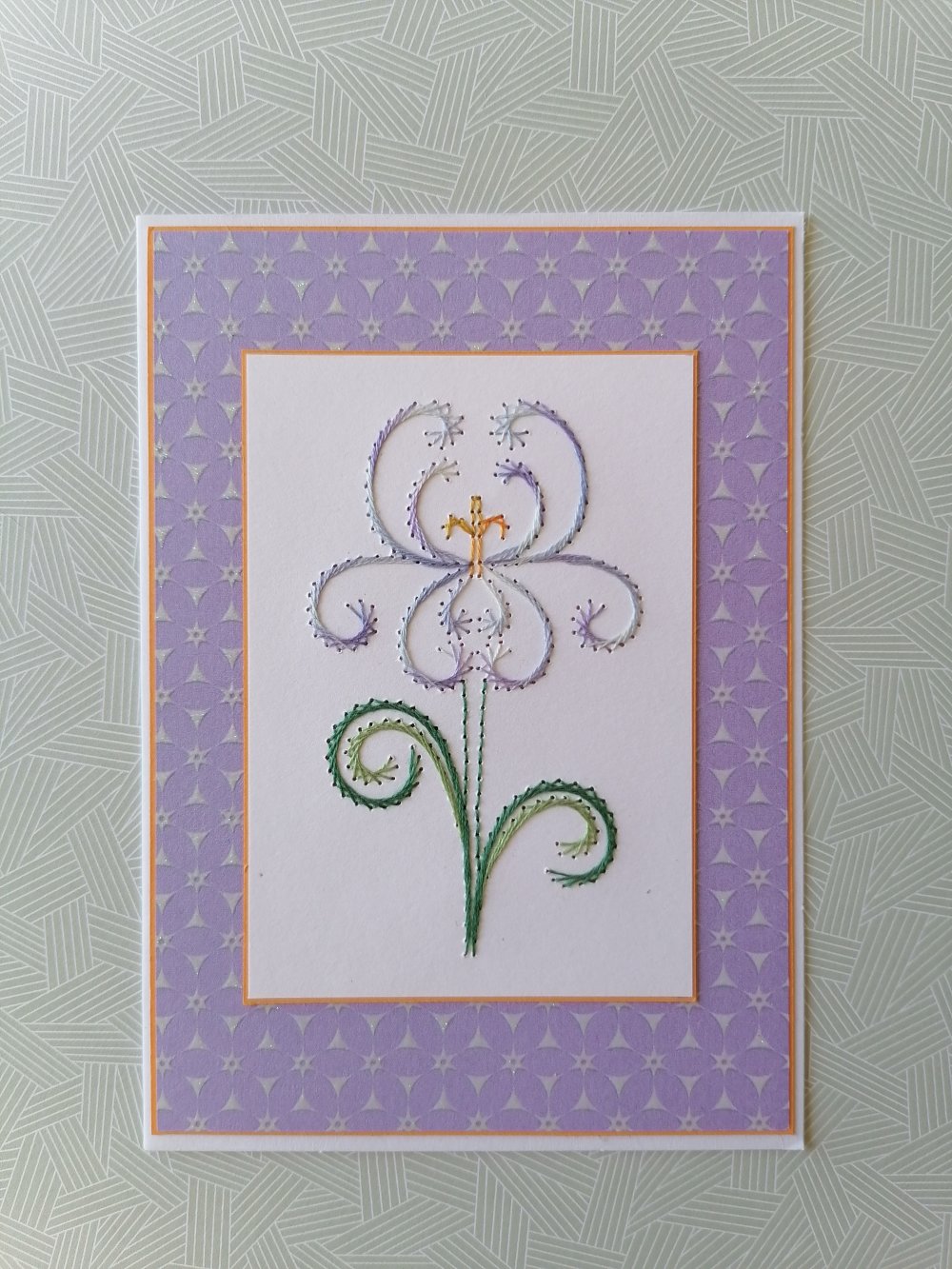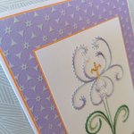 Carte double, base blanche, brodée d'un iris, sur papier de fond imprimé dans les tons assortis à la broderie