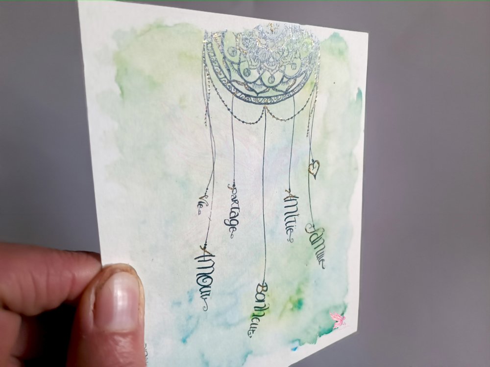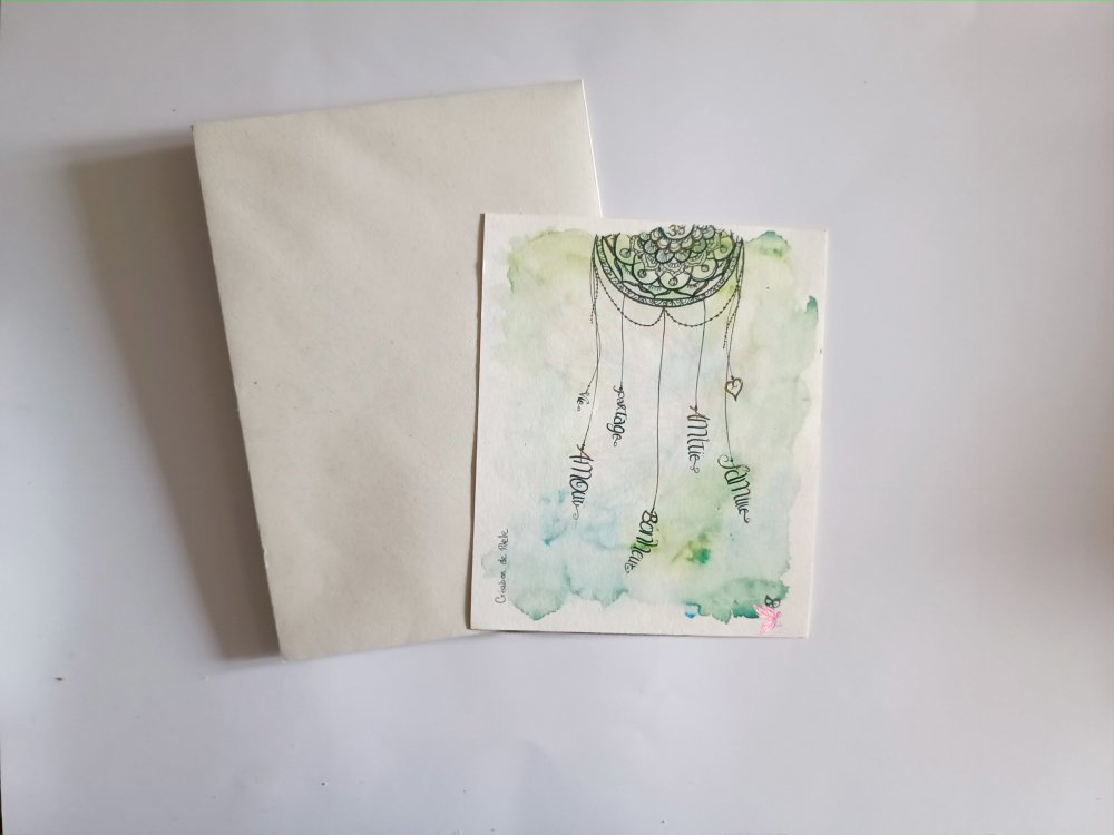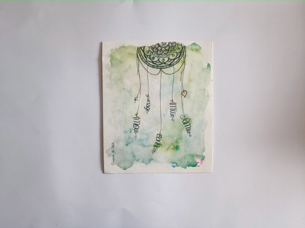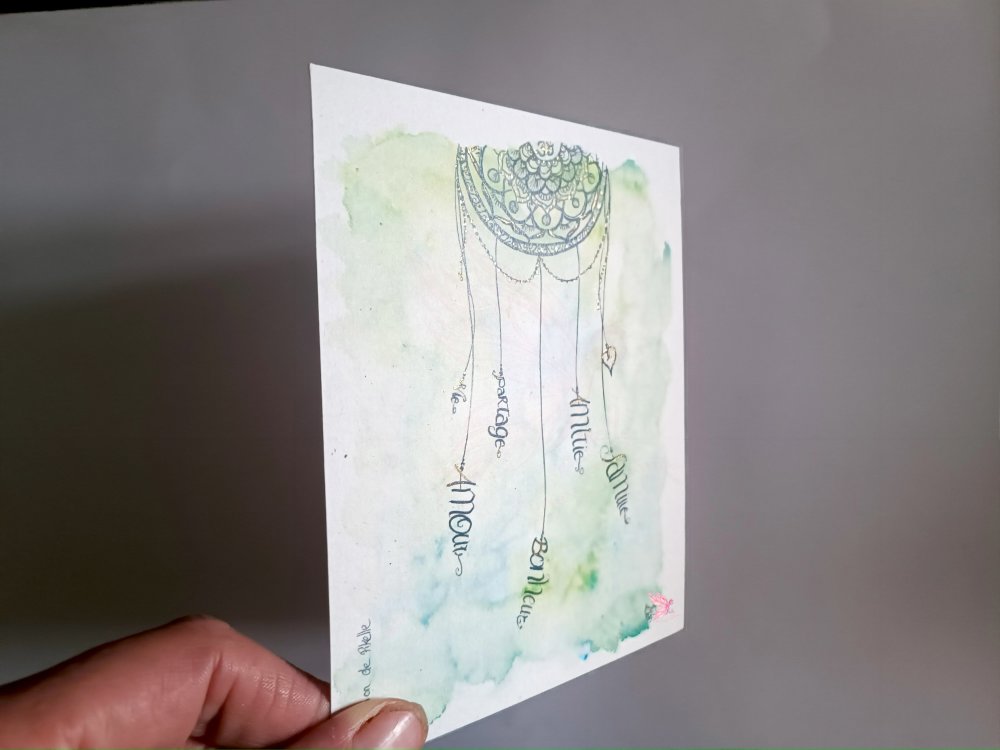 Je travaille principalement des matières naturelles (aquarelle végétale, papiers recyclé ou fait main, plumes naturelles,…).